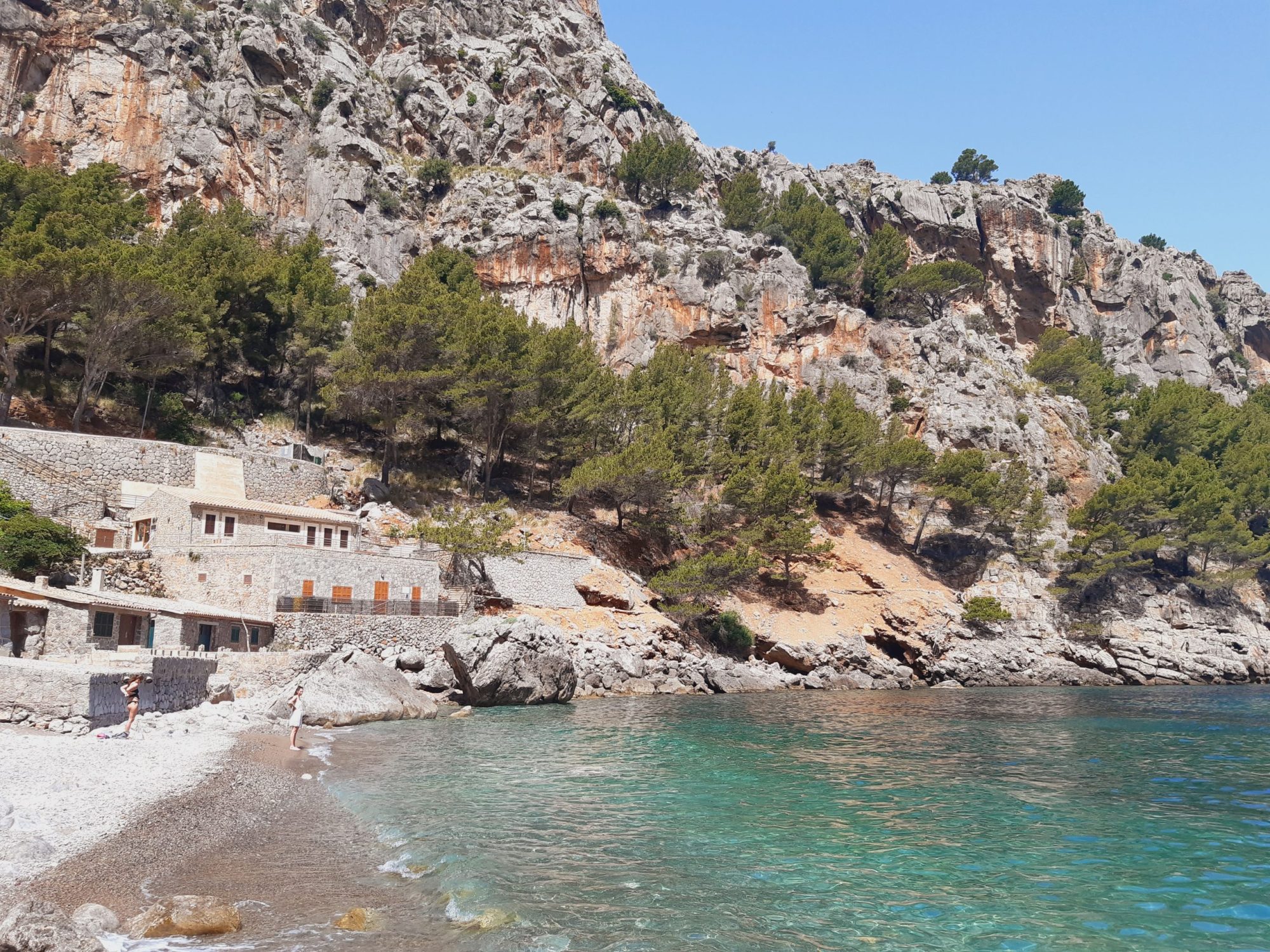 Vi skal igennem en mørk tunnel i bjerget ca. 200 meter af vejen inden bjerget åbner sig og åbenbarer en strand med runde hvide sten, der ligger skjult inde en dal. Landskabet er som taget ud af Jurassic Park filmene og jeg forventer halvt om halvt, at der kommer en spinosaurus frem af busken. To floder kommer inde fra midten af øen, den ene fra Lluc og den anden fra Cuber. Her inden stranden forenes de og løber ud i det klareste blå vand.