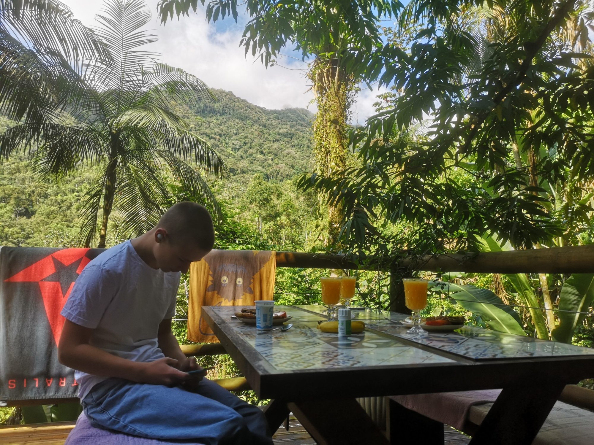 Vi skal bo tre nætter i et lille skovchalét inde i regnskoven. Martha ejer de 4 huse og hun taler engelsk! Det var dejligt. Men bedst er det, at Martha har wifi i hytten. Rasmus falder om i sofaen og forsvinder ud på nettet.