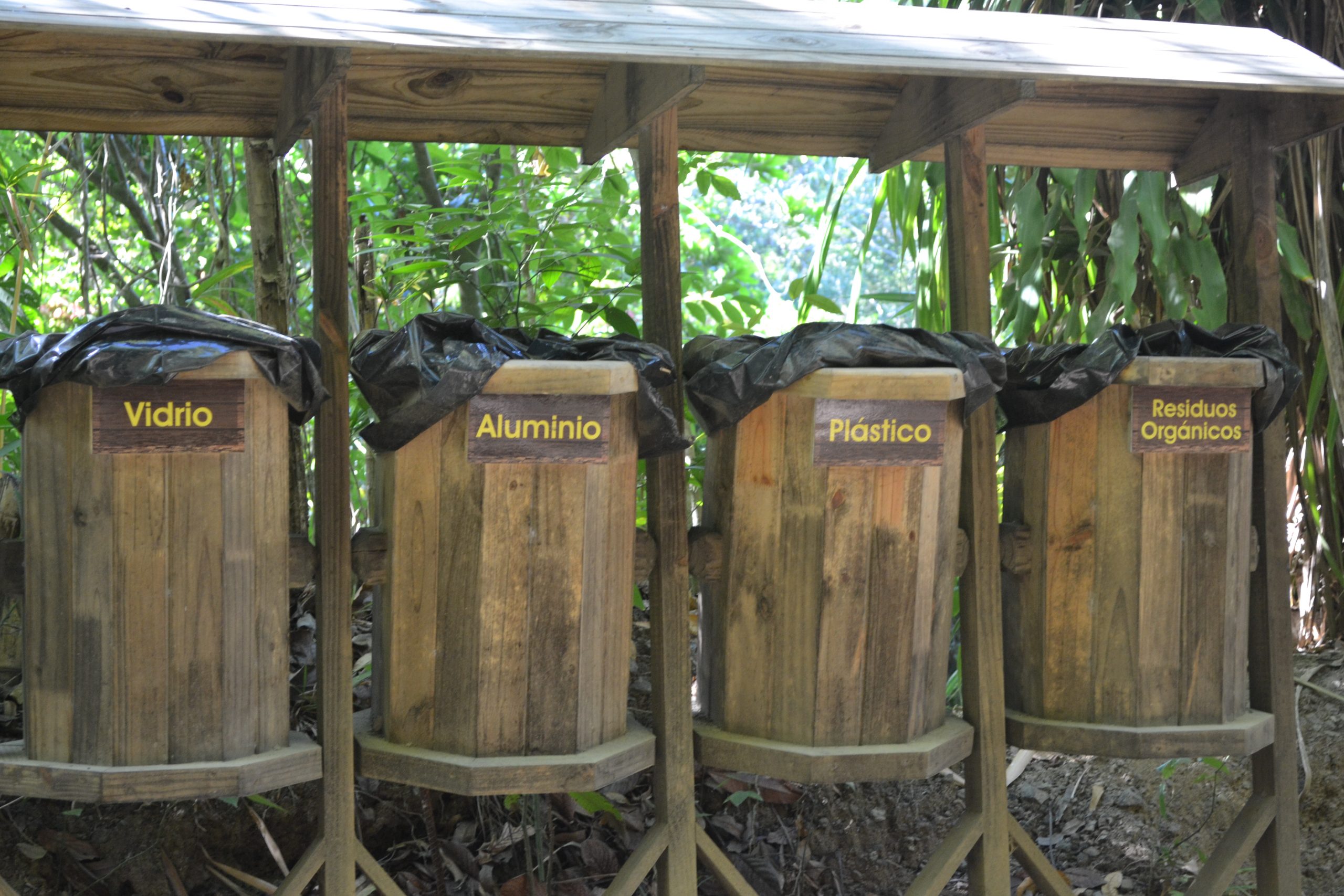 I indkørslen til det, der skulle have været drømmehotellet i Jacó, står 4 sorteringsspande til affald. Ligegyldigt hvor vi er, park, vej, hus, hotel eller som her, på vej op til en bunke ruiner på privat grund, så er der affaldssortering. Costa Rica har fat i den lange ende med genbrug og det er nemt, for det er samme fraktioner alle steder.