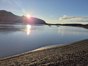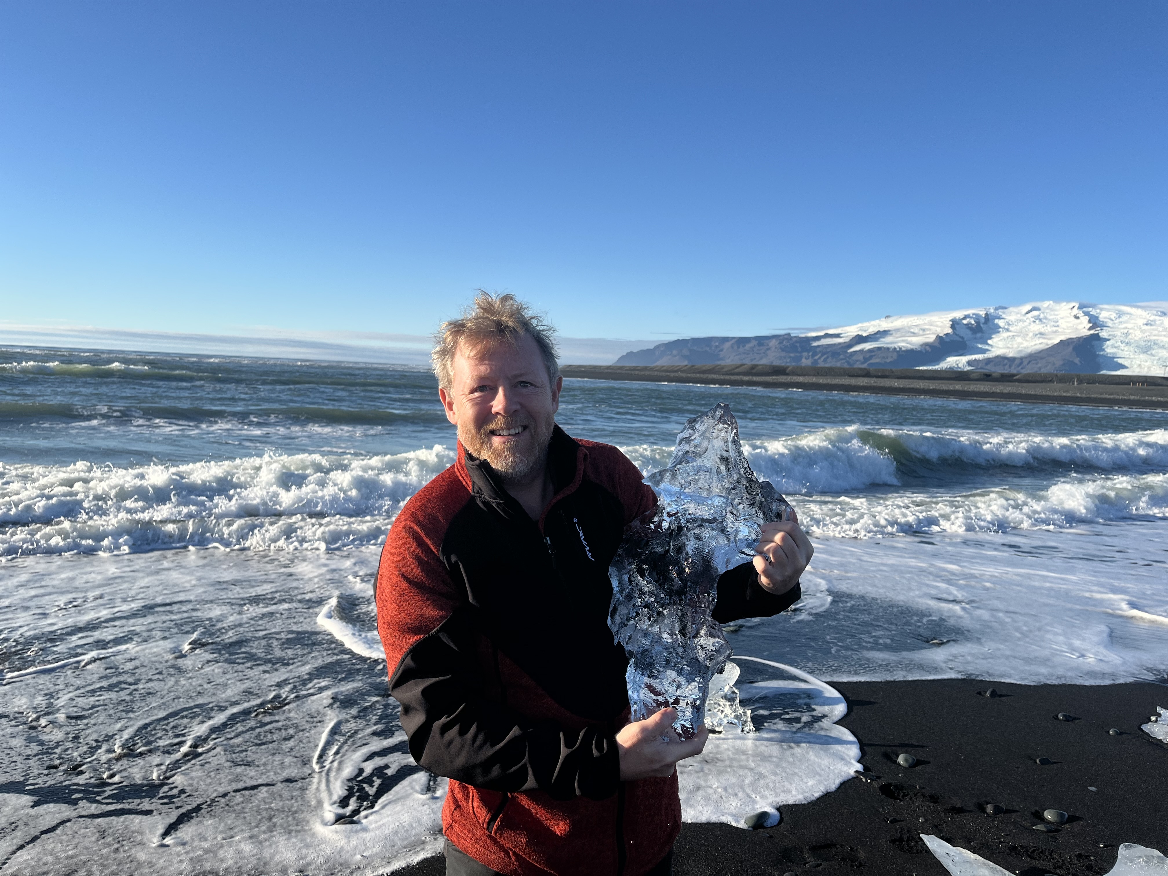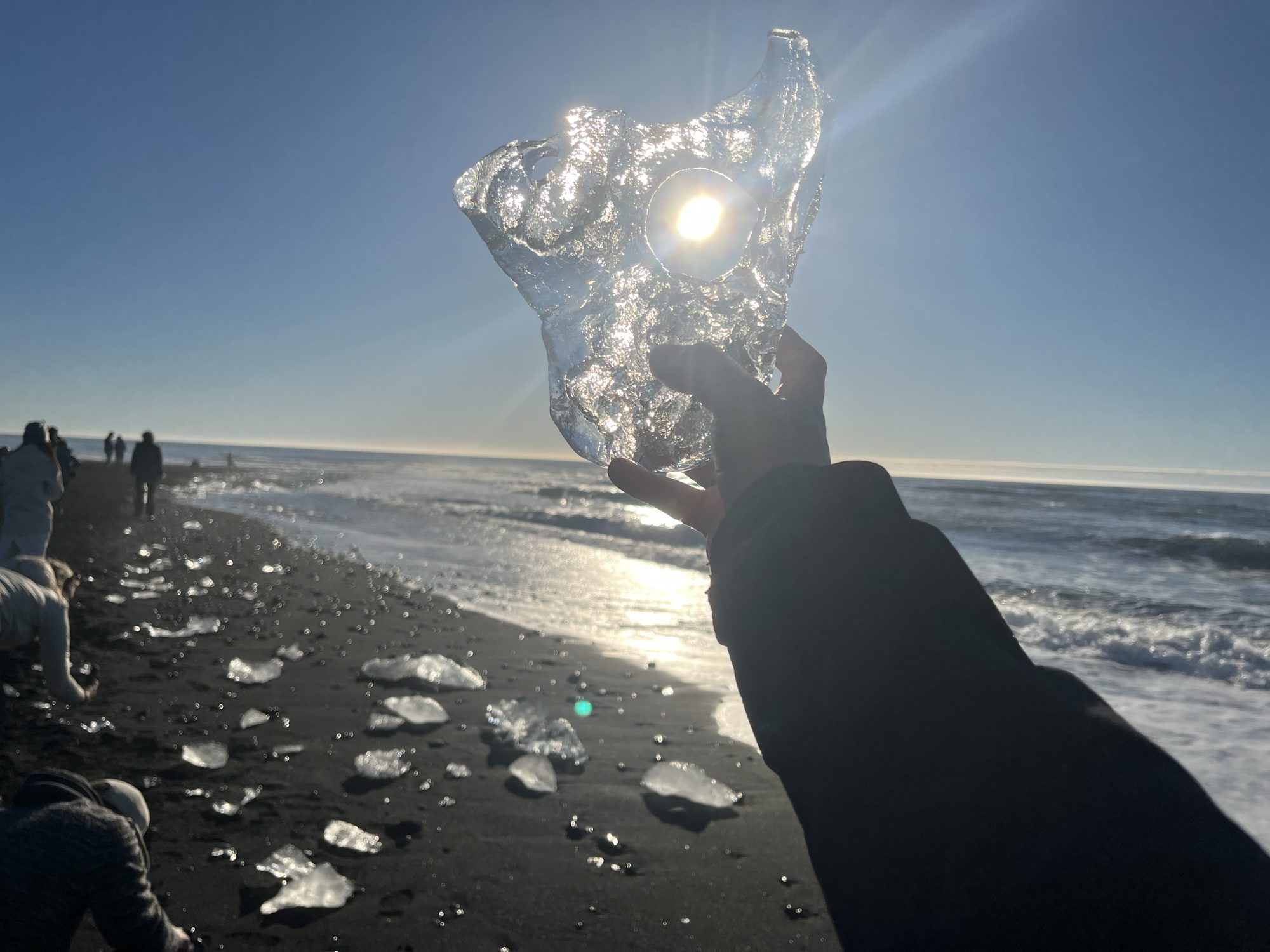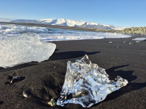Efter besøget kørte vi videre i camperen mod Diamond Beach. Vejen dertil var lang, men udsigten gjorde det svært at kede sig. Da vi ankom, lå stranden fyldt med isstykker, der skinnede på det sorte sand. Det var ret imponerende, også selvom det var et af de mere turistede steder.