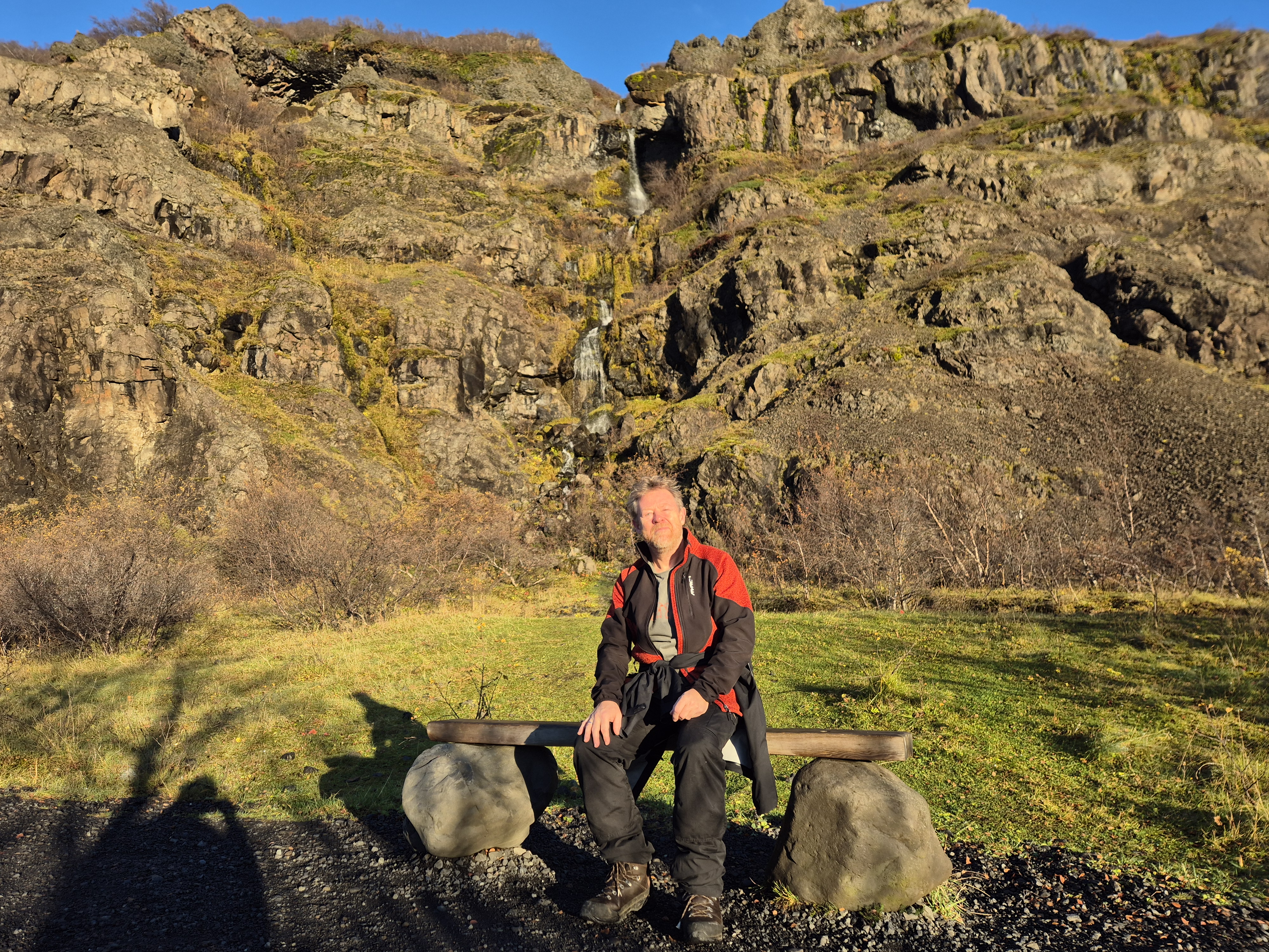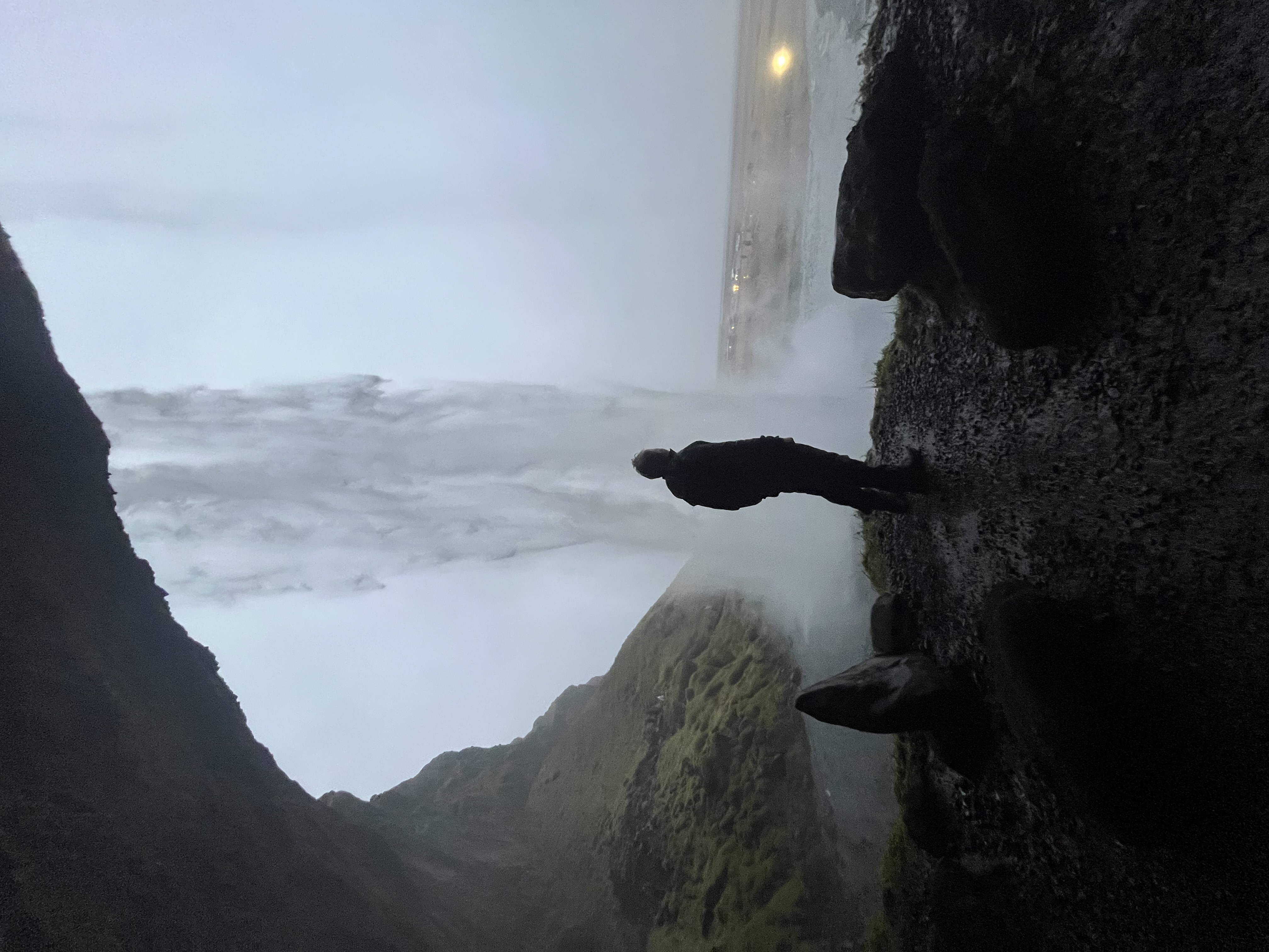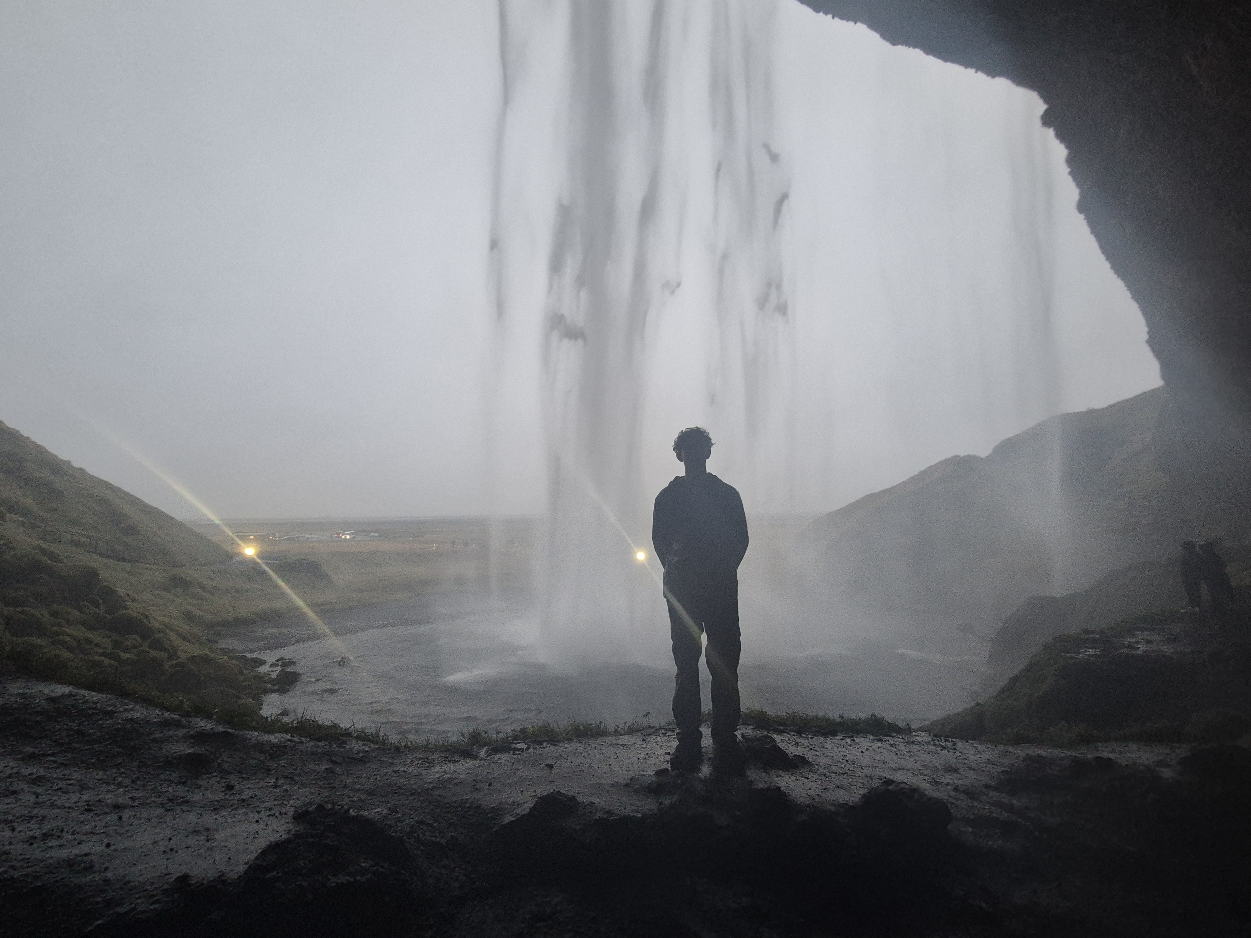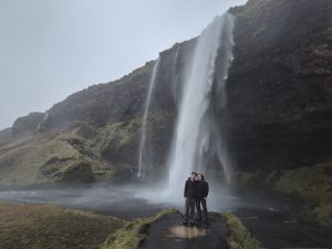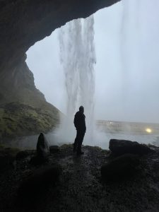 Kort efter kørte vi videre mod Rangárþing eystra. Her ligger Seljalandsfoss, et kendt vandfald, man kan gå om bag. Det var en sjov, men også våd oplevelse, for da vi kom helt tæt om bag vandfaldet, slog vinden os et pus og fik den store vandmængde til at flyve lige i hovedet på os.