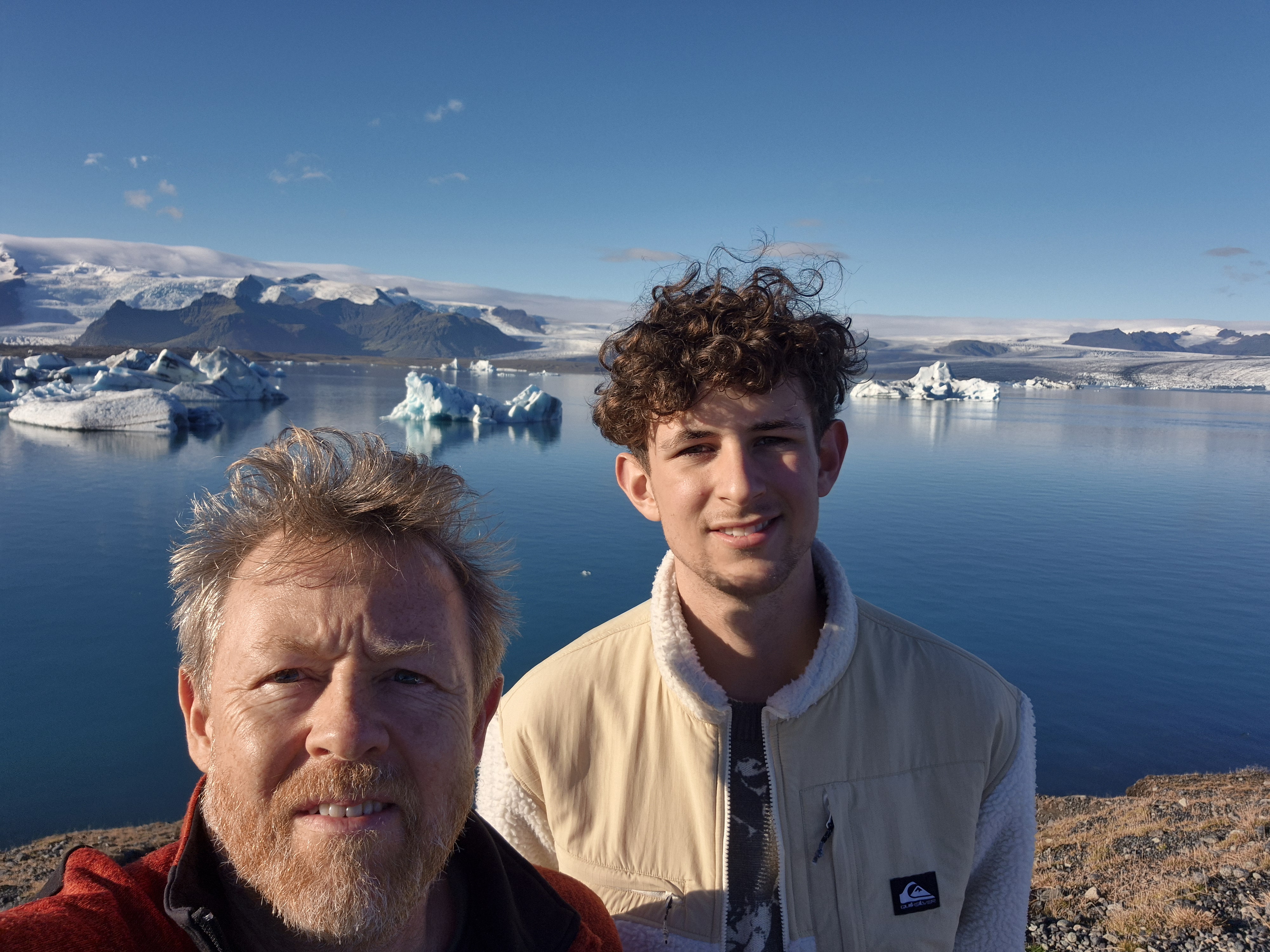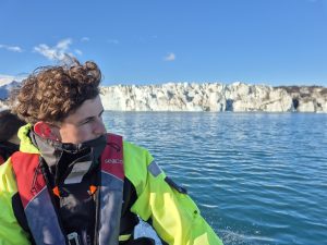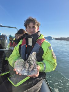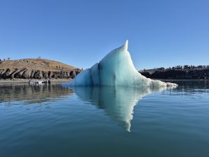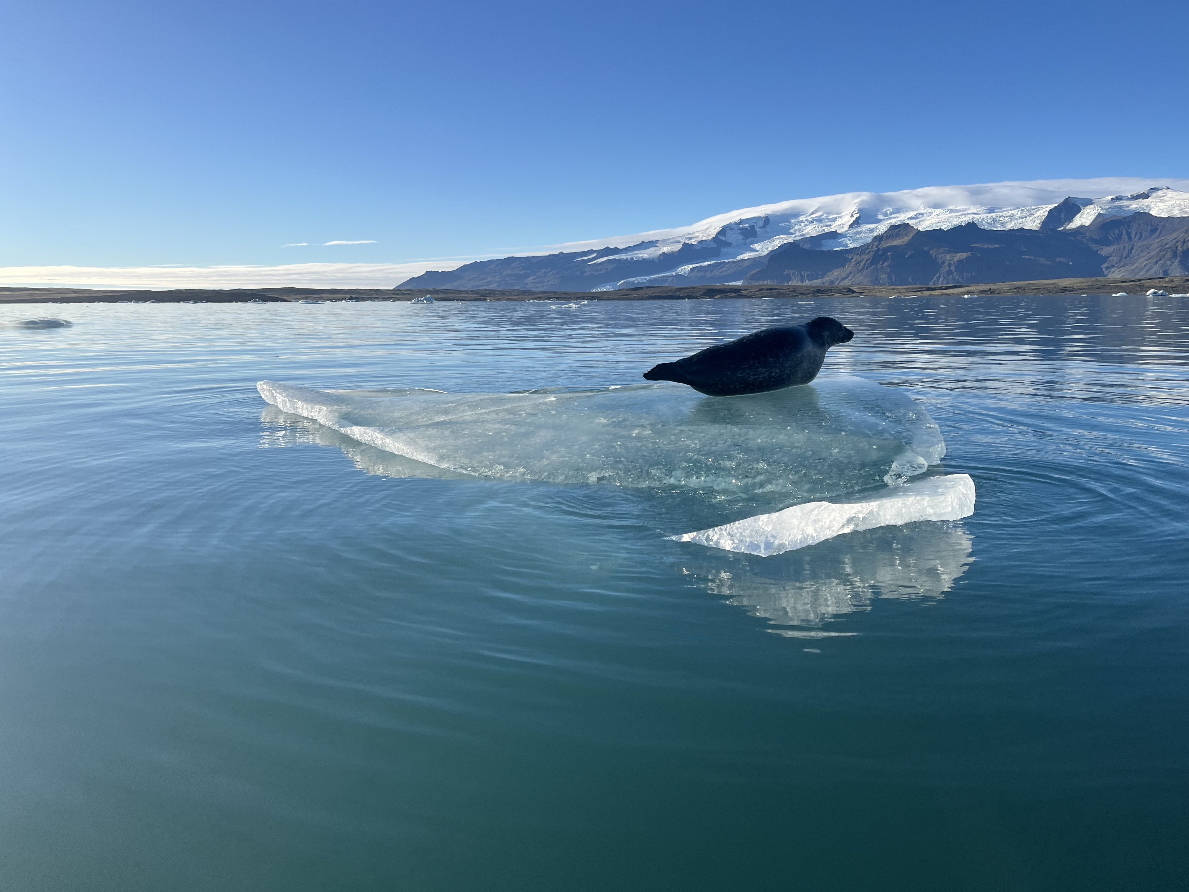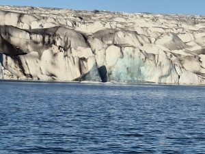 Vi skulle på bådtur ude på lagunen ved gletsjeren, og guiden var både dygtig og ret underholdende. Han gik rundt og kom med små jokes, mens han fortalte om isens bevægelser og området. På turen så vi sæler, der lå og dasede på isen, og vi kom tæt nok på isbjergene til, at man kunne se alle de små revner og detaljer.