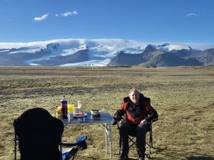Frokosten blev spist i nærheden, simpelt og hurtigt, men med en udsigt til bjergene, som gjorde det lidt mere specielt end normalt. Camperen stod parkeret med front mod landskabet, og det føltes som at have fået et bord i første række.