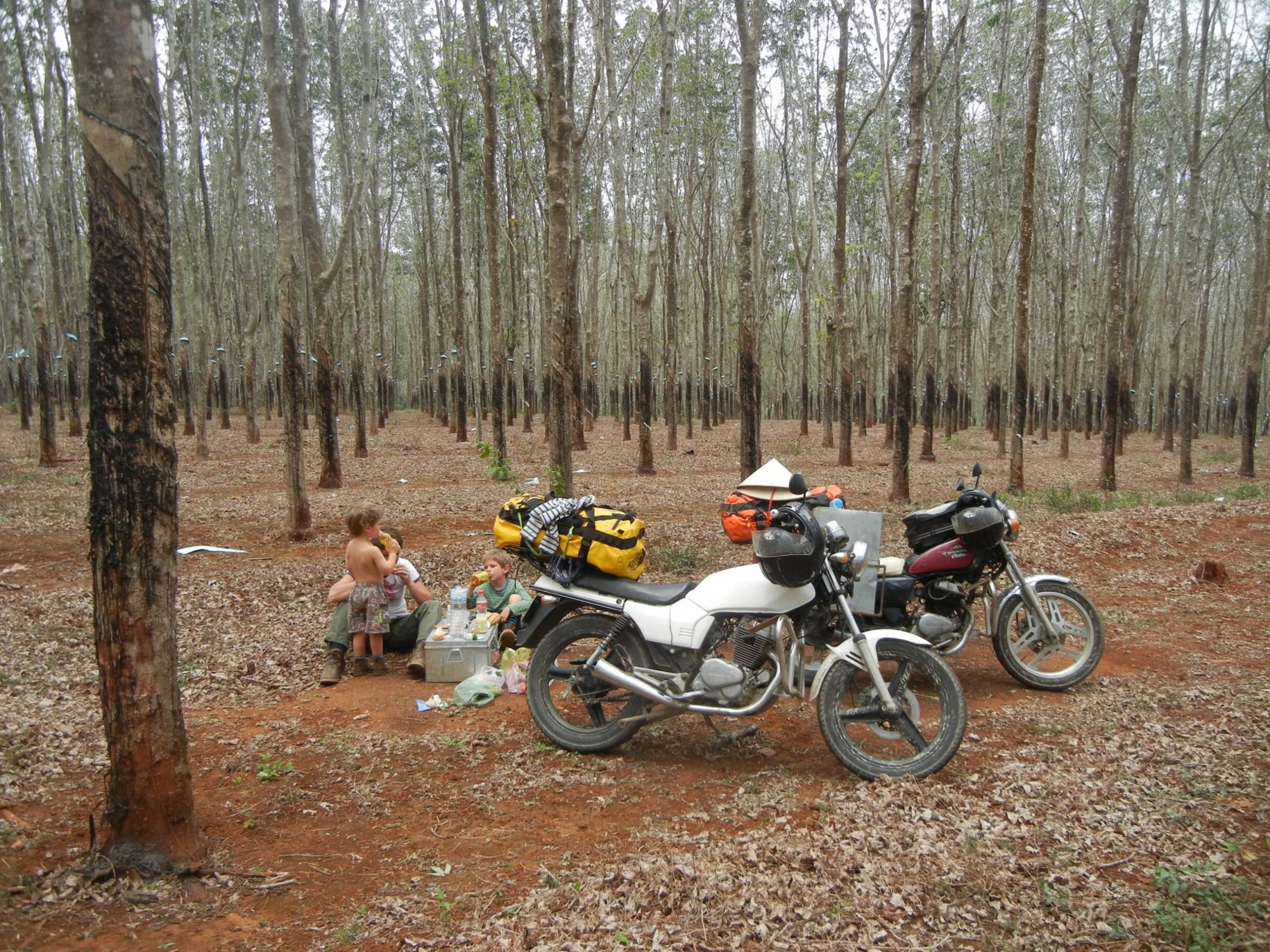 Vi holder frokost i en gummitraesplantage, hvor vi spiser vores broed, tomater og agurker. Drengene har for en gangs skyld for lov til at spille lidt nintendo i frokostpausen, for Mads og jeg skal lige have kigget Luffe lidt. Da vi har gjodt det, vil den ikke starte. Vi konluderer, at nogle ledninger maa have rystet sig loes paa turen hen over hullerne i vejen og at vi godt kan skubbe den igang igen. Heldigvis starter den dog i 5. forsoeg og vi krydser fingre for, at ledningerne er hoppet paa plads igen 🙂 Resten af turen gaar gennem landsbyer, via hullede veje og nogle steder ikkeveje.