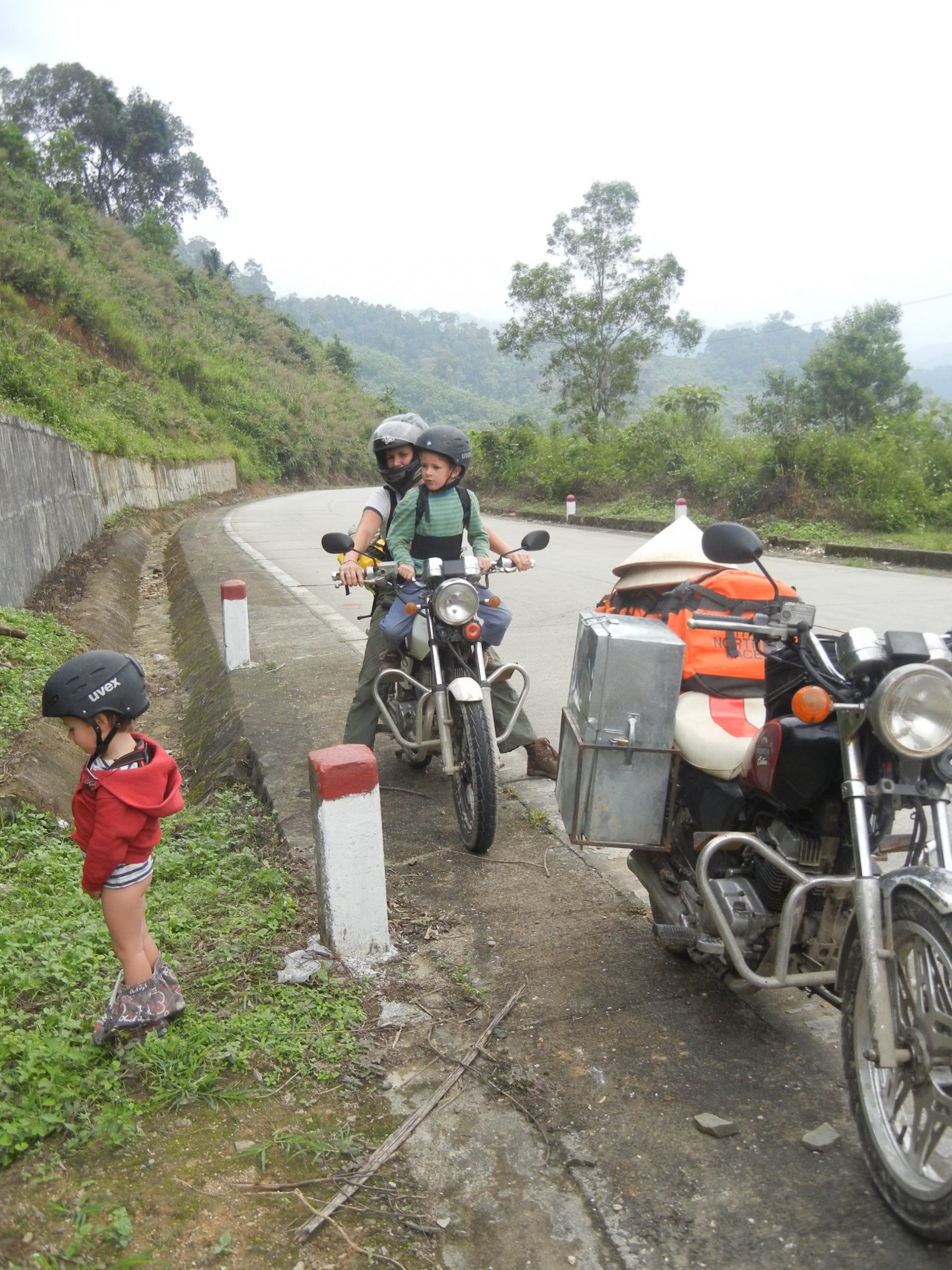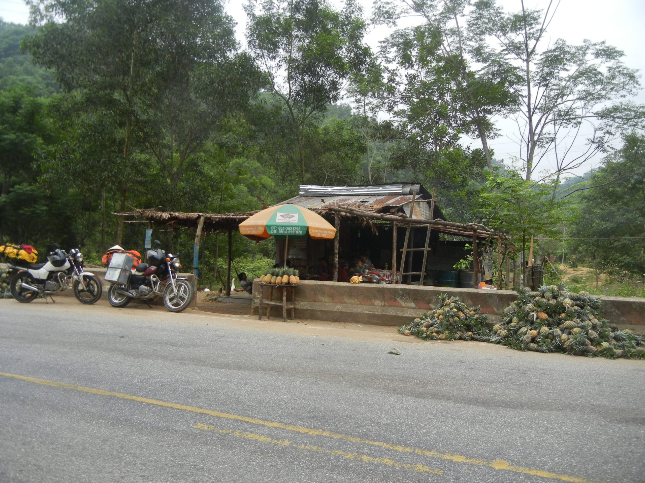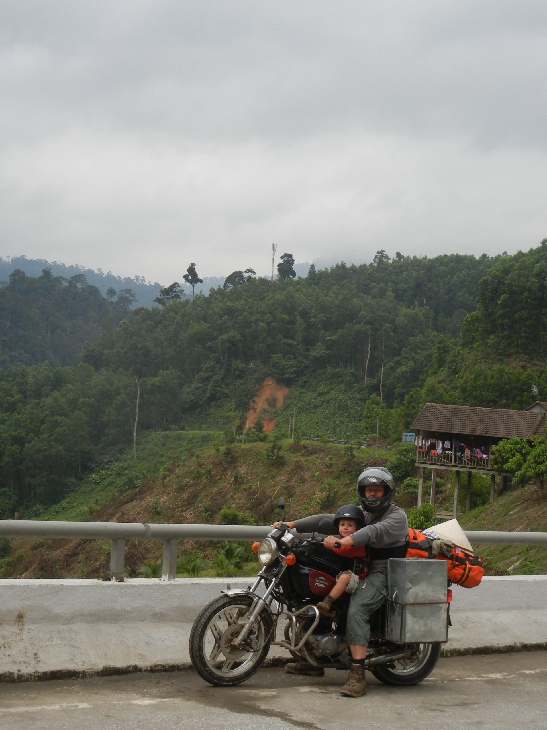 Vi forlader Da Nang i halvdaarligt vejr og bruger ca. en halv time paa at komme ud af forstaederne. Husene bliver mere og mere spartanske og i overgangen op til bjergene er de kun braedder paa smaa skurer. Vi er paa vej ind i hoejlandet og et vaesentligt mere kuperet terraen end vi er vandt til fra kysten. Vejene snor sig op, op mellem banan- og kaffeplantager og ved frokost er vi naaet frem til skovene, hvor der hoestes ananas. Vi stopper for nuddelsuppe ved vejkanten og mens 4 – 5 vietnamesere ser til fra haengekoejer, bliver der taendt op i komfuret, saa vi kan faa kogt vores nudler. Det er siesta i Vietnam mellem 12 og 14 og ananasarbejderne i haengekoejerne nyder den stille regn, der drypper paa bliktaget. Det goer vi ogsaa indtil drengene opdager gaesene omme bag skuret. De er store og de gaar i flok og saa gider de ikke at blive forstyrret at to regnvaaede danske drenge, der gerne vil rappe med. Legen gaar nu ud paa, hvem der toer komme taettest paa den skraeppende flok gaes. Fantastisk underholdning for de haengende ananasarbejdere, som sikkert gladeligt havde betalt os for forstillingen, hvis vi havde spurgt.