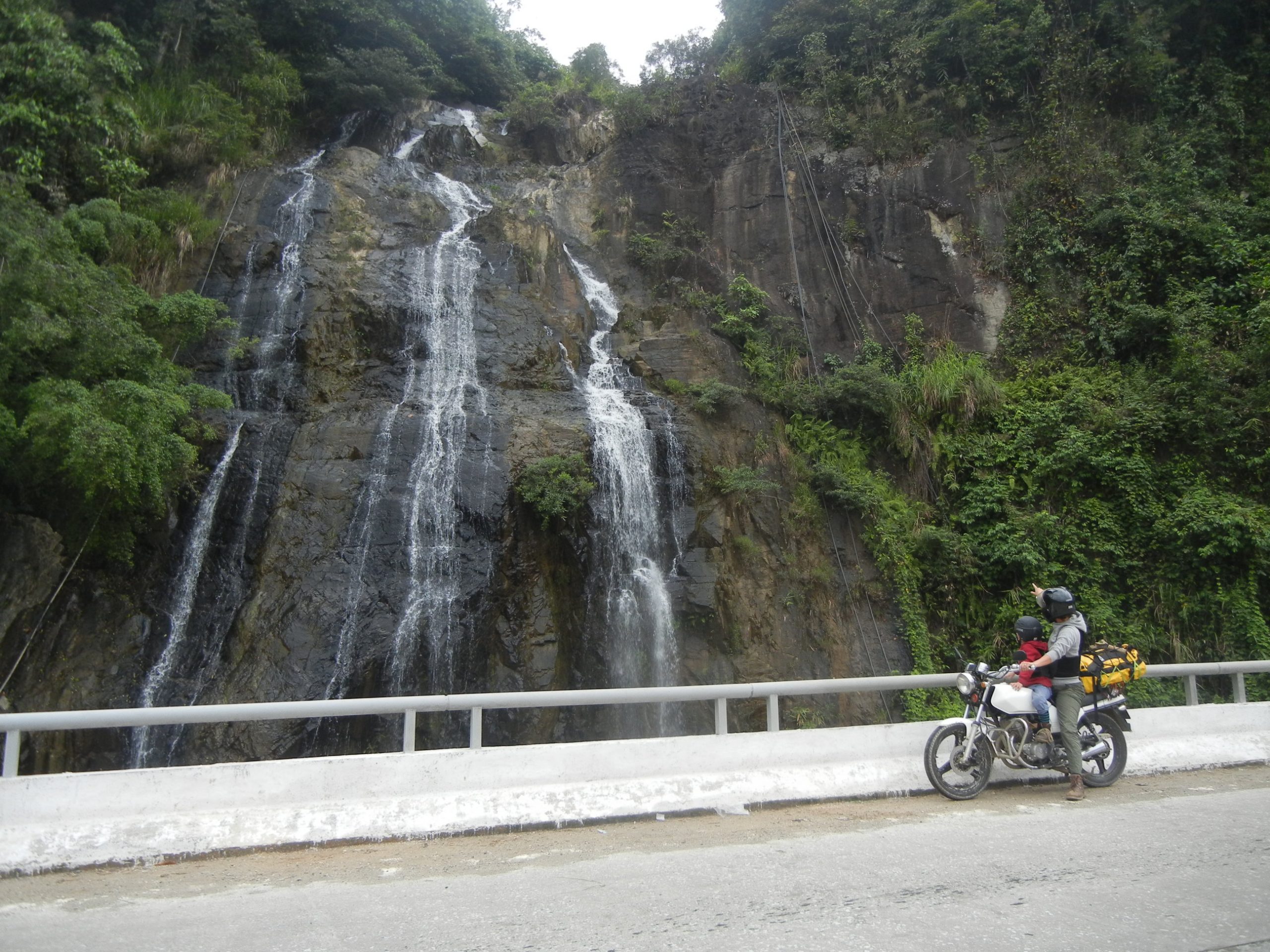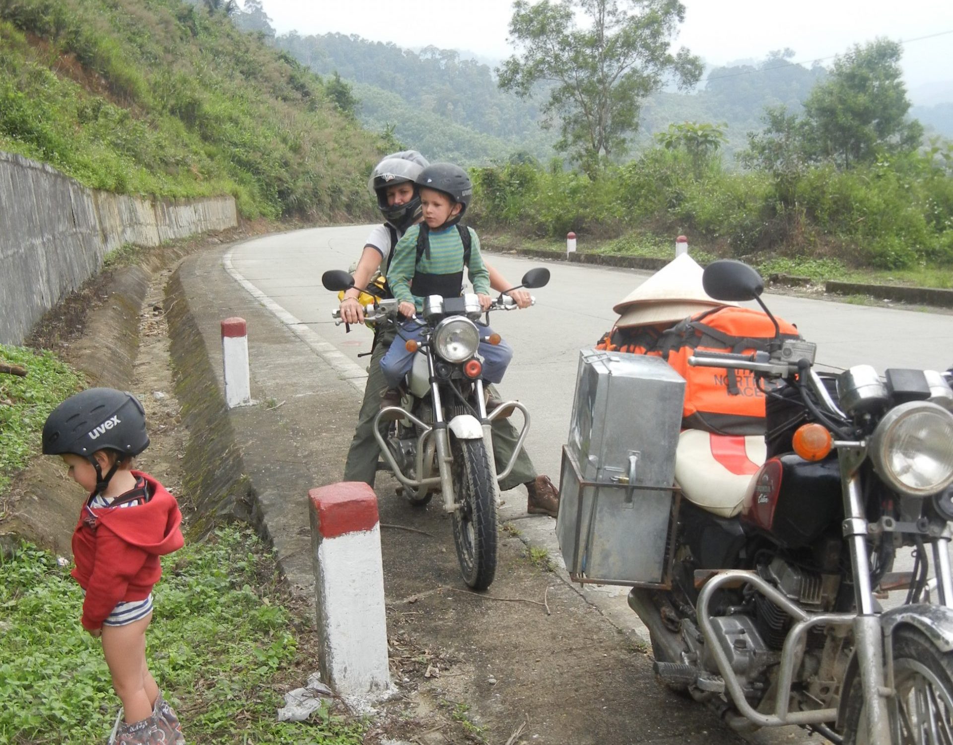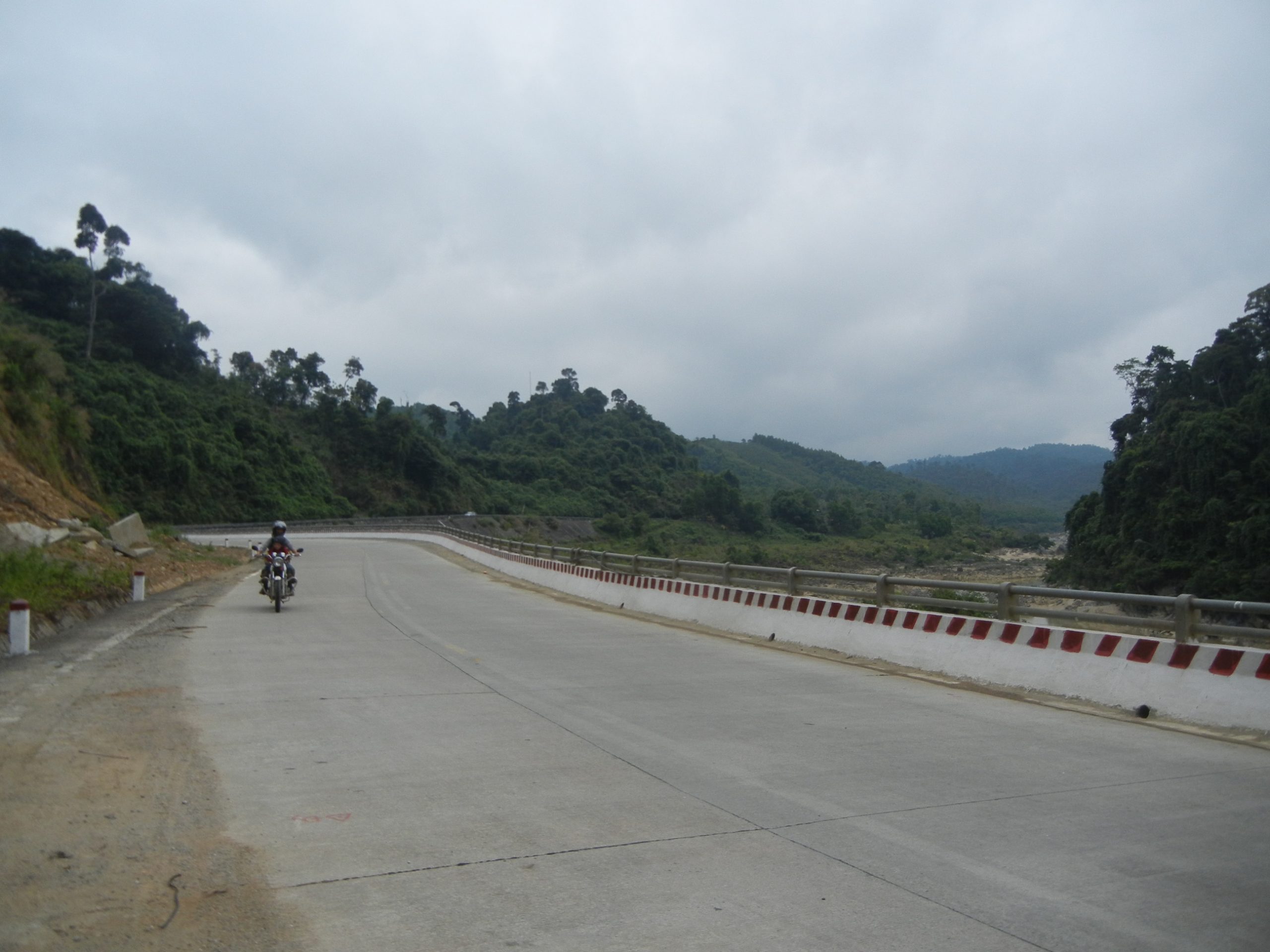 Vi forlader Da Nang i halvdaarligt vejr og bruger ca. en halv time paa at komme ud af forstaederne. Husene bliver mere og mere spartanske og i overgangen op til bjergene er de kun braedder paa smaa skurer. Vi er paa vej ind i hoejlandet og et vaesentligt mere kuperet terraen end vi er vandt til fra kysten. Vejene snor sig op, op mellem banan- og kaffeplantager og ved frokost er vi naaet frem til skovene, hvor der hoestes ananas. Vi stopper for nuddelsuppe ved vejkanten og mens 4 – 5 vietnamesere ser til fra haengekoejer, bliver der taendt op i komfuret, saa vi kan faa kogt vores nudler. Det er siesta i Vietnam mellem 12 og 14 og ananasarbejderne i haengekoejerne nyder den stille regn, der drypper paa bliktaget. Det goer vi ogsaa indtil drengene opdager gaesene omme bag skuret. De er store og de gaar i flok og saa gider de ikke at blive forstyrret at to regnvaaede danske drenge, der gerne vil rappe med. Legen gaar nu ud paa, hvem der toer komme taettest paa den skraeppende flok gaes. Fantastisk underholdning for de haengende ananasarbejdere, som sikkert gladeligt havde betalt os for forstillingen, hvis vi havde spurgt.