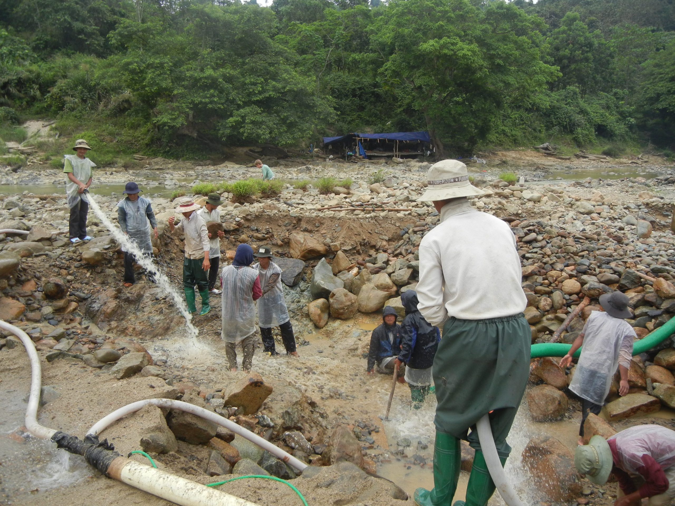 Det er varmt og vi har fulgt en flod et stykke tid, da vi stopper for at straekke ben. Ned ad en lille sti og ud i flodlejet, hvor vi moedes af en gruppe mennesker, som arbejder med at flytte sten og suge vand op fra en lille lomme, de har inddeaemmet ude midt i floden. Bertel bruger 5 sekunder paa at smide toejet og er saa afsted paa fiskejagt med Mads lige i haelene, mens Rasmus og jeg bliver inde ved kanten og piller i traestammer og smaa indsoeer.