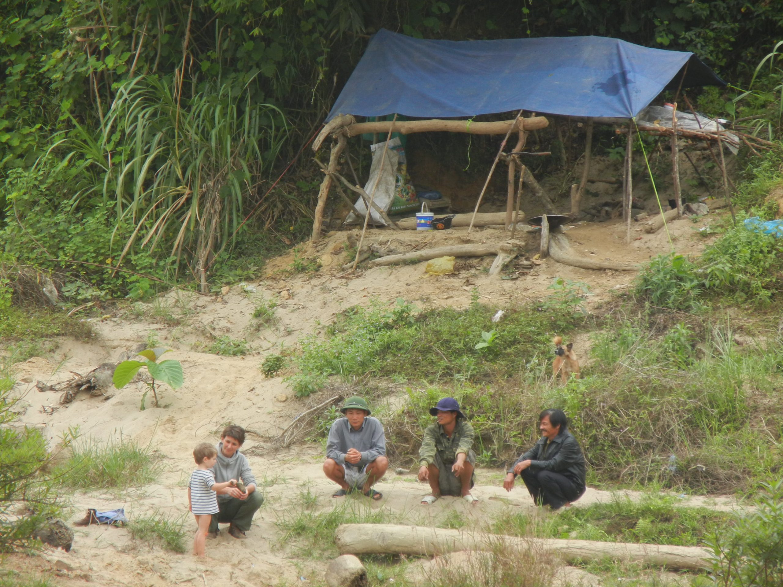 Der kommer 3 maend hen og saetter sig 5 meter fra os. Vi er vandt til at blive kigget paa, saa vi venter lidt indtil de er klar til at tale med os, – og saa bliver vi spurgt om alder og koen paa boernene. Jeg faar at vide, at maendene leder efter guld og stille og roligt arbejder sig op igennem floden for at finde det. Det virker ikke som om det ligefrem vaelter op, men de er vist godt tilfredse. Vi taler ved hjaelp af tegnsprog og faa vietnamesiske ord og det virker ok. Vi triller videre efter det forfriskende fodbad og taeller springvand paa Luffe. Paa Lynet, hvor Rasmus og Mads leder turen, bliver der sunget Halfdans ABC og talt til hundrede.