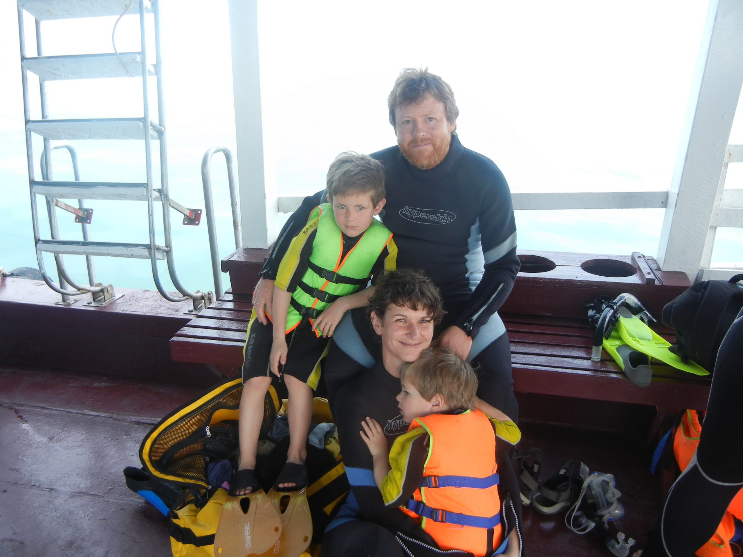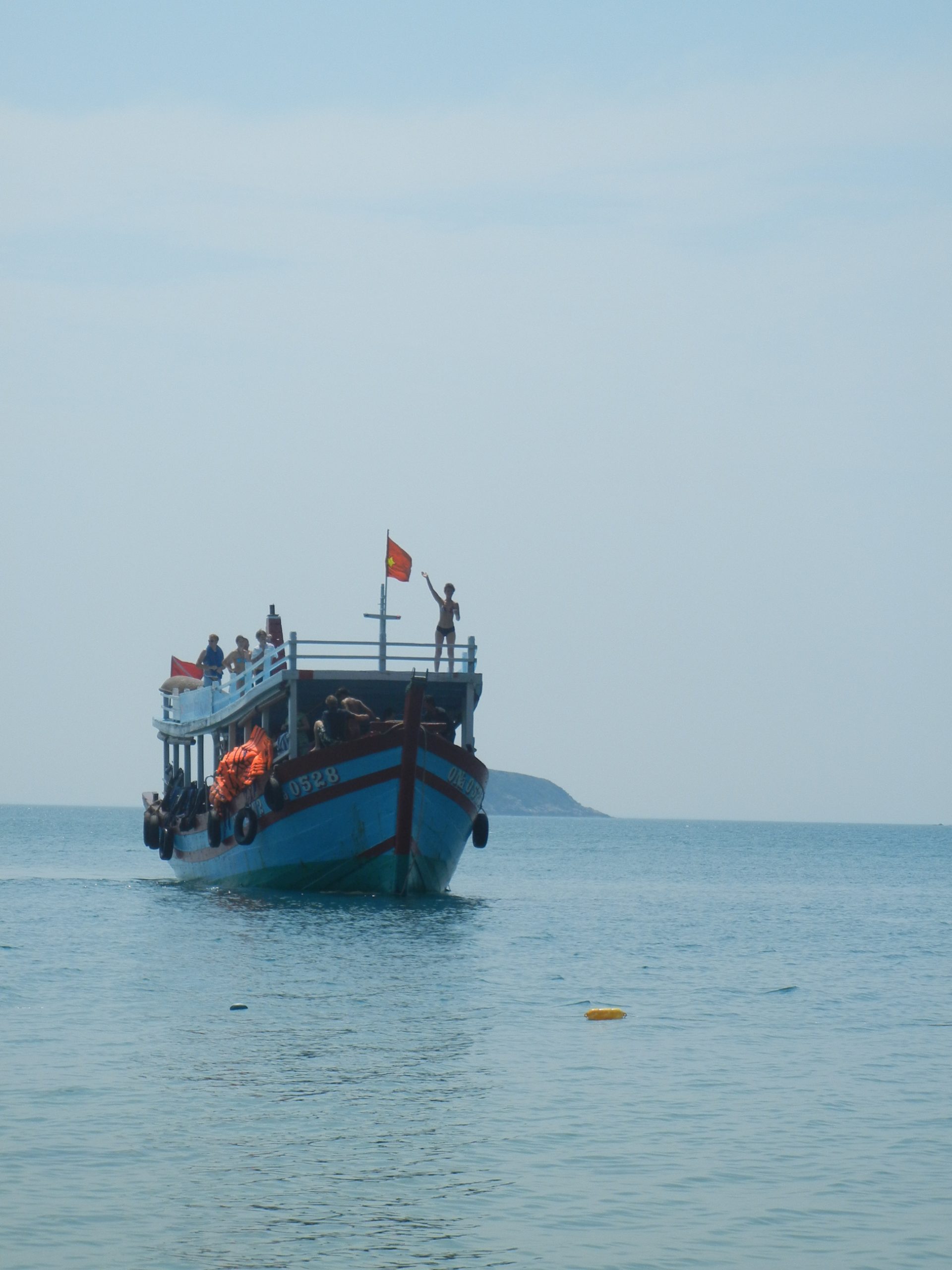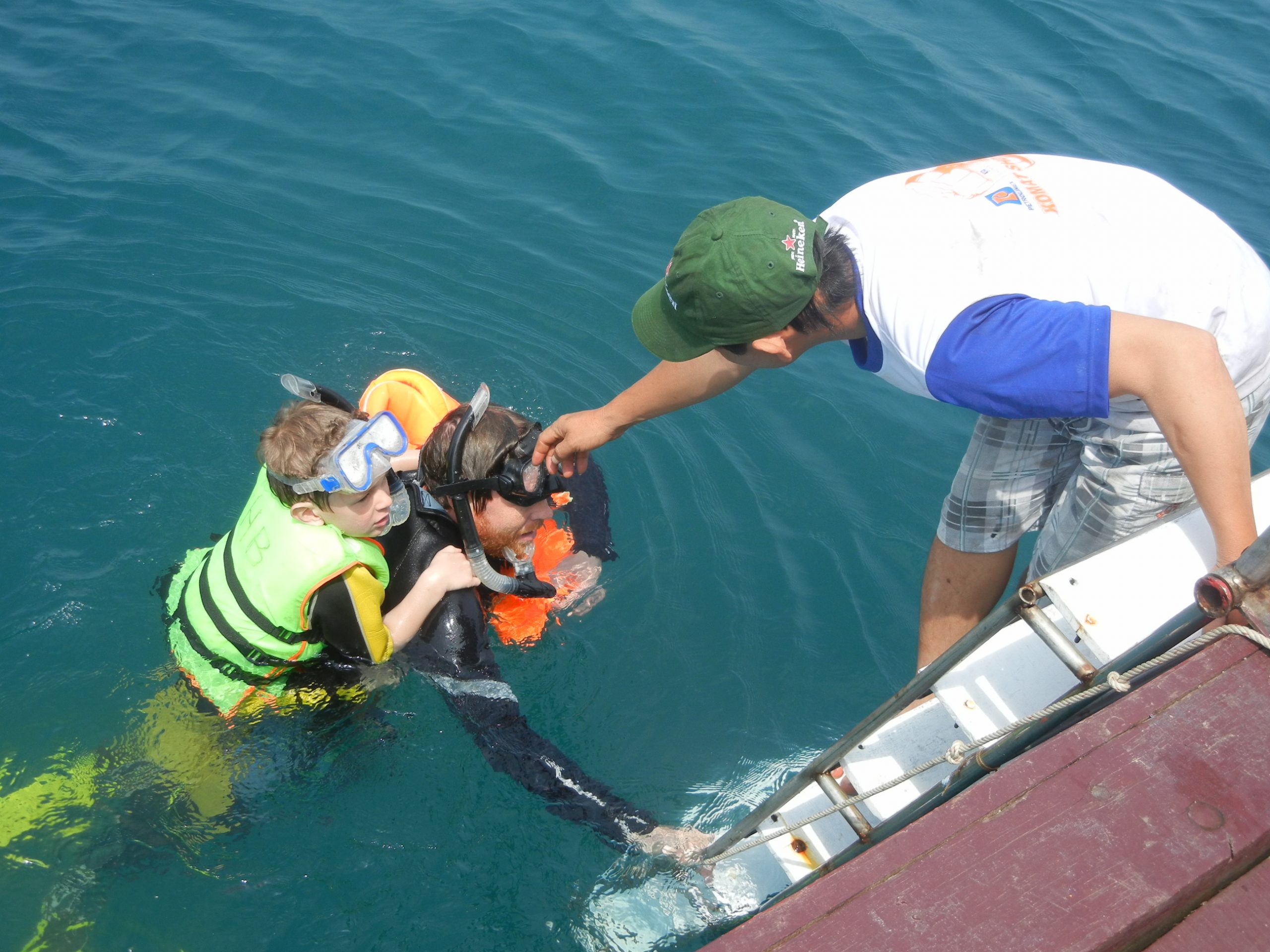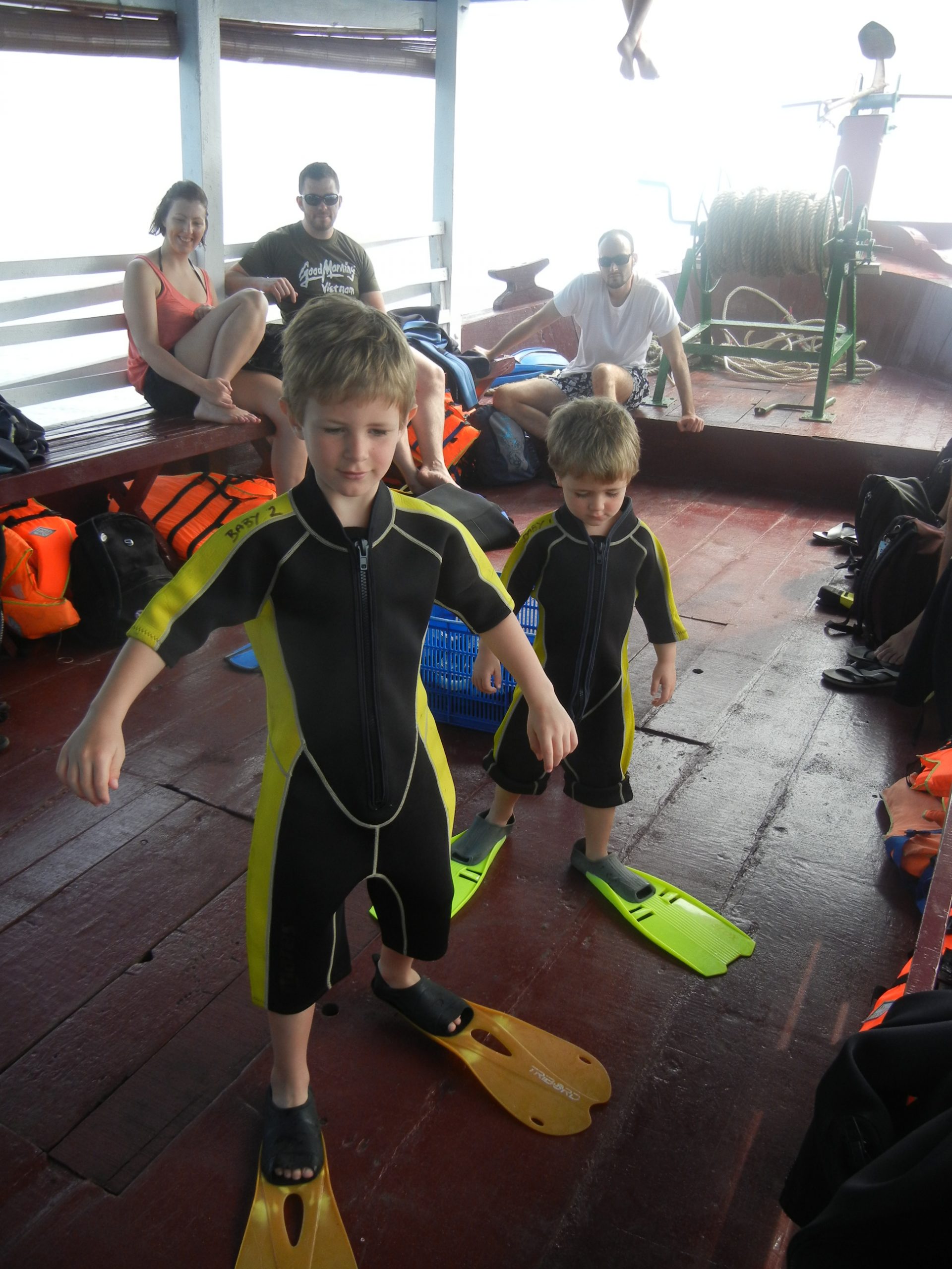 Vi finder paa historier og drengene er vaeldig spaendte ombord paa baaden. Luigi, som er fastboende italiener med belgisk kone, har sin lille dykkerbiks her i Hoi An og fortaeller, at fordi vi kun lige er statet paa saesonen, skal vi kun forvente at se smaa fisk.