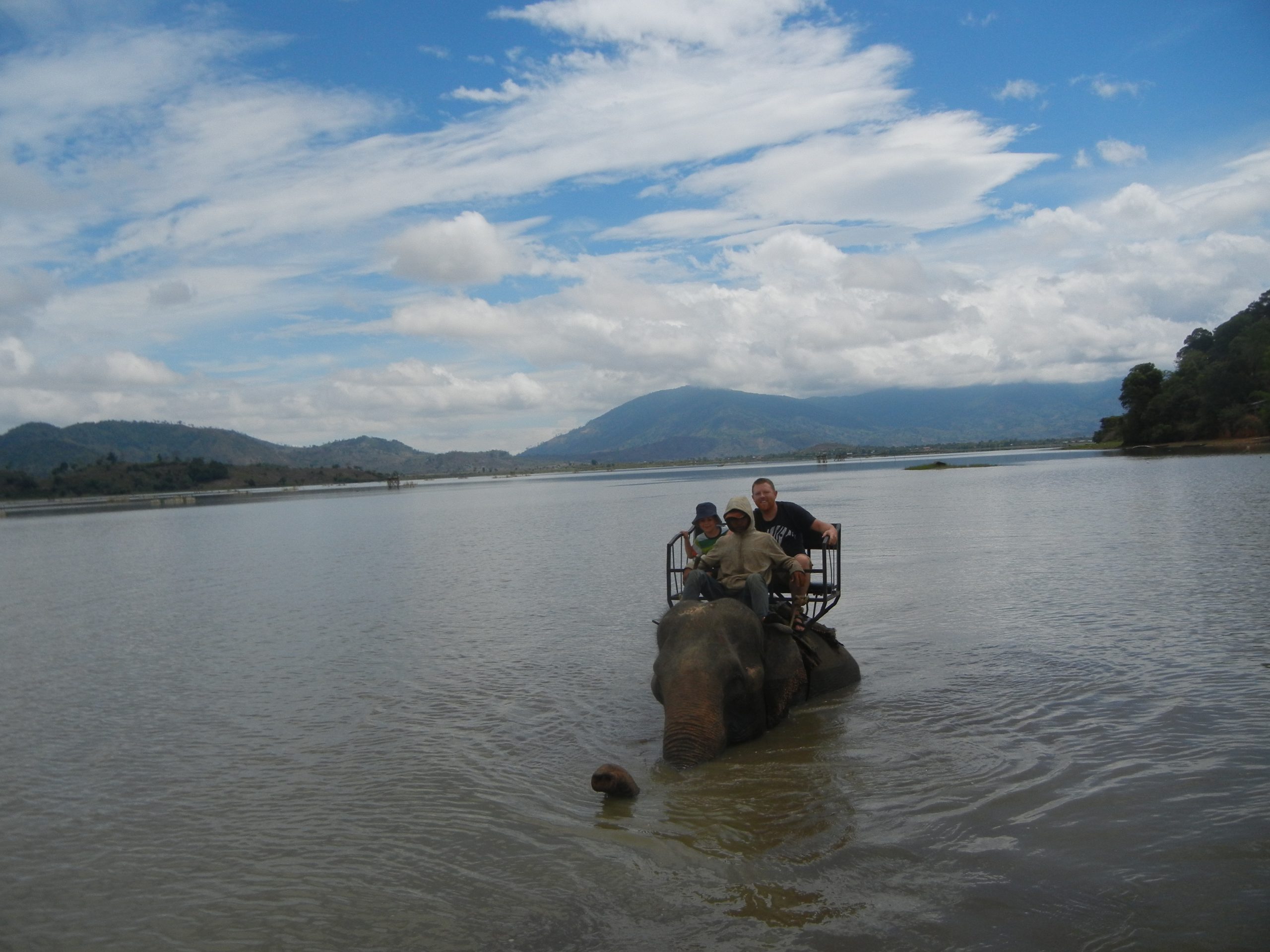Ved Lak Lake bliver Rasmus og Mads sat paa en elefant. Bertel og jeg tager kongen. En kaempe elefanthan. Elefantens ejer sidder paa elefantens nakke og styrer den ved hjaelp af sine foedder bag dens oerer. Vi tager turen halvvejs rundt om soeen og saa skal elefanten bade, for den vandrer ud i soeen og begynder af svoemme.