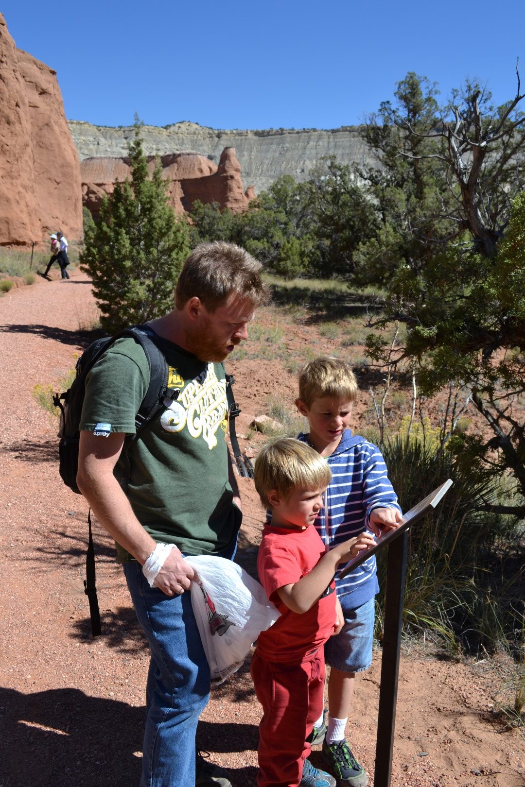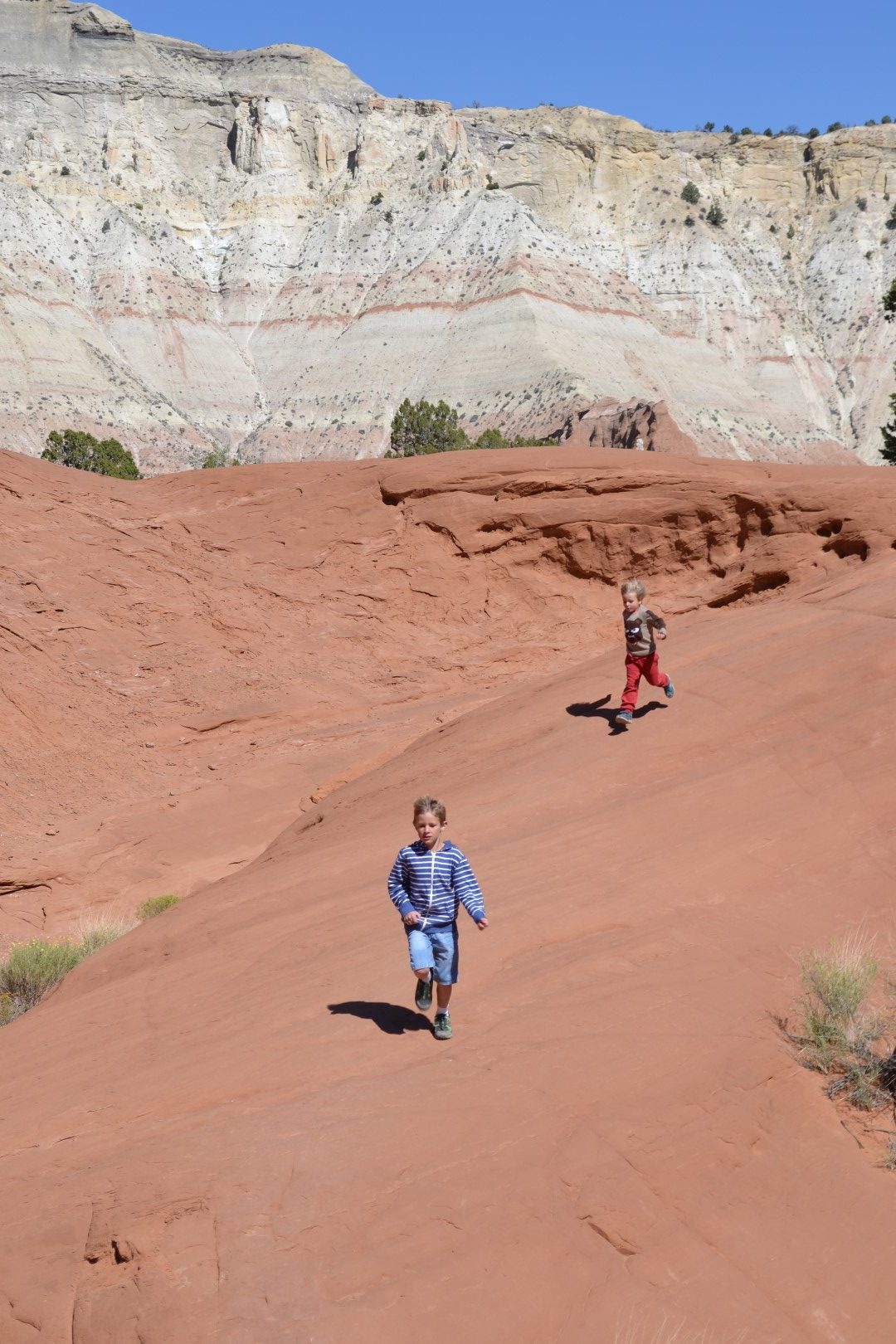 I Kodacrome Statepark, som har fået sit navn på grund af sine fotogene landskabsvueer, tager vi en kort vandretur rundt i klippelandskabet. Der bor skorpioner og slanger i parken og med dette in mente, får turen en tak op på farlighedsmeteret. I parken tilbyder man også lærdom til de besøgende børn i form af et Juniorrangerbevis. For at gøre sig fortjent til denne udemærkelse, skal man kende parkens regler, samle affald (det er ikke noget, jeg fandt på denne gang) og kende til parkens fauna. Begge drenge opnår juniorrangerstatus med bravur og belønnes af en meget ung seniorranger med en guldstjerne til at sætte på jakken. Vel hjemme i camperen streger Bertel den sætning ud på beviset, som henviser til, at man skal lytte til sine forældre, mens man er i parken. Ja, det er ikke altid nemt med den lærdom.