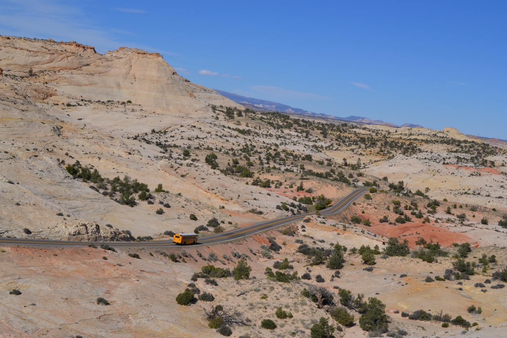 Vi kører videre på den karakteristiske koksgrå vej med de gule striber og bliver i et sving overhalet af en skolebus. Hvem der kører med den og hvorhen er endnu et af de spændende spørgsmål, som dukker op. Vi har kørt godt 20 miles uden at have set et hus eller for den sags skyld en skole, men selvfølgelig ligger de der, de spredte ranches. Det er afstandene, som bare tolkes helt anderledes her i Utah, hvor selv små byer ligger tæt, hvis der er under 50 miles imellem dem.