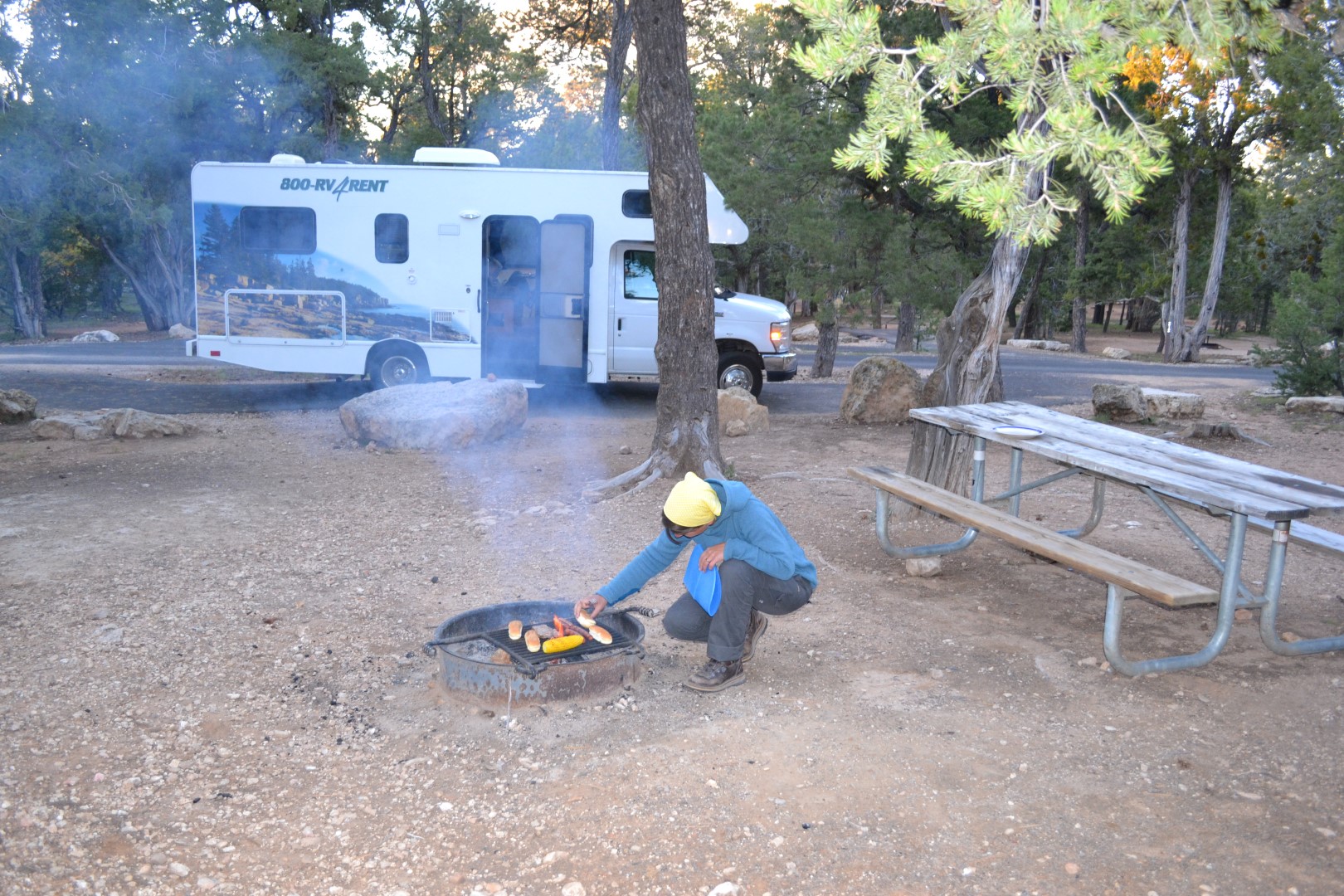 Kl. 8.30 spiser vi morgenmad på vores helt egen plads på Mathers Campground i Grand Canyon. Hvad vi havde opgivet hjemmefra, bliver nu muligt på grund af budgetkrisen. Fedt! Endelige kommer der noget fornuftigt ud af det politiske virak.