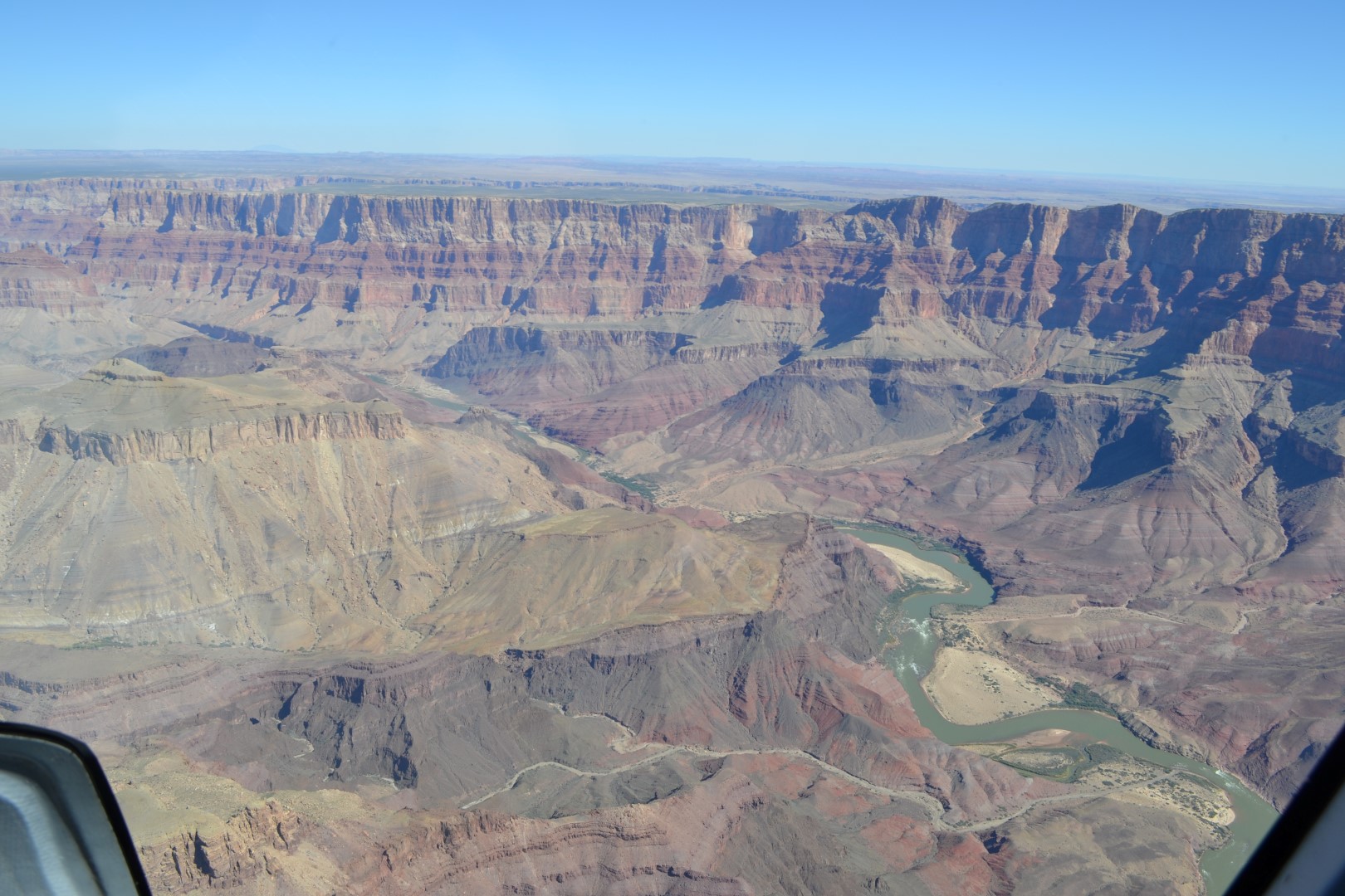 Dagen efter tager vi turen i helikopter ud over kløften og må sande, at Grand Canyon ikke kan rummes fuldt ud, selv ikke fra luften. Det er for utroligt! Det bliver ikke bedre af, at piloten sætter soundtracket fra Rumrejsen 2001 på, mens vi flyver ud over dybet.