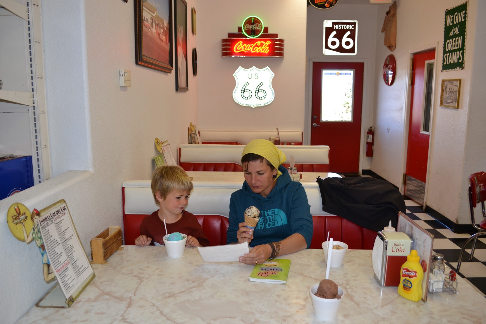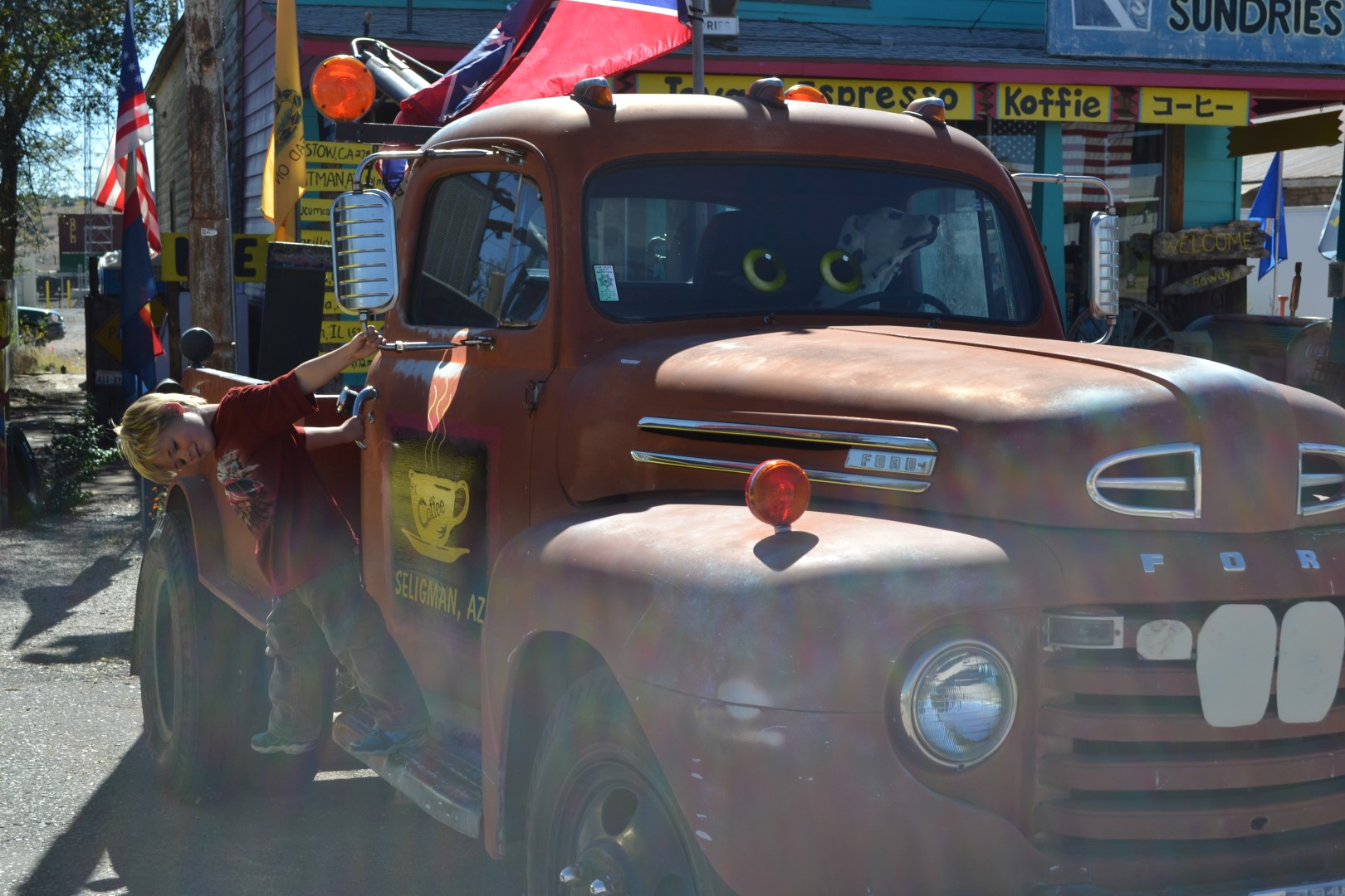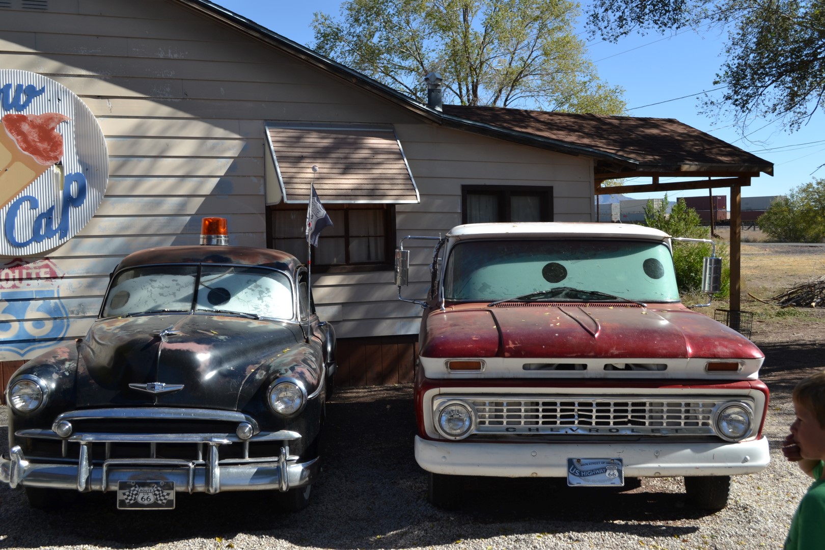 Vi skal gennem Williams og snuse til stemningen fra 60’erne. Det bliver til en is hos Twisters til lyden af tidens musik. Mon man også havde skrigende blå is dengang? Vi følger 66 til Seligman, hvor de gamle biler fra dengang har fået nyt liv qua filmen ”cars”. Alle bilerne kigger på os gennem store tegneserieøje og drengene krammer dem, som var de gamle venner.