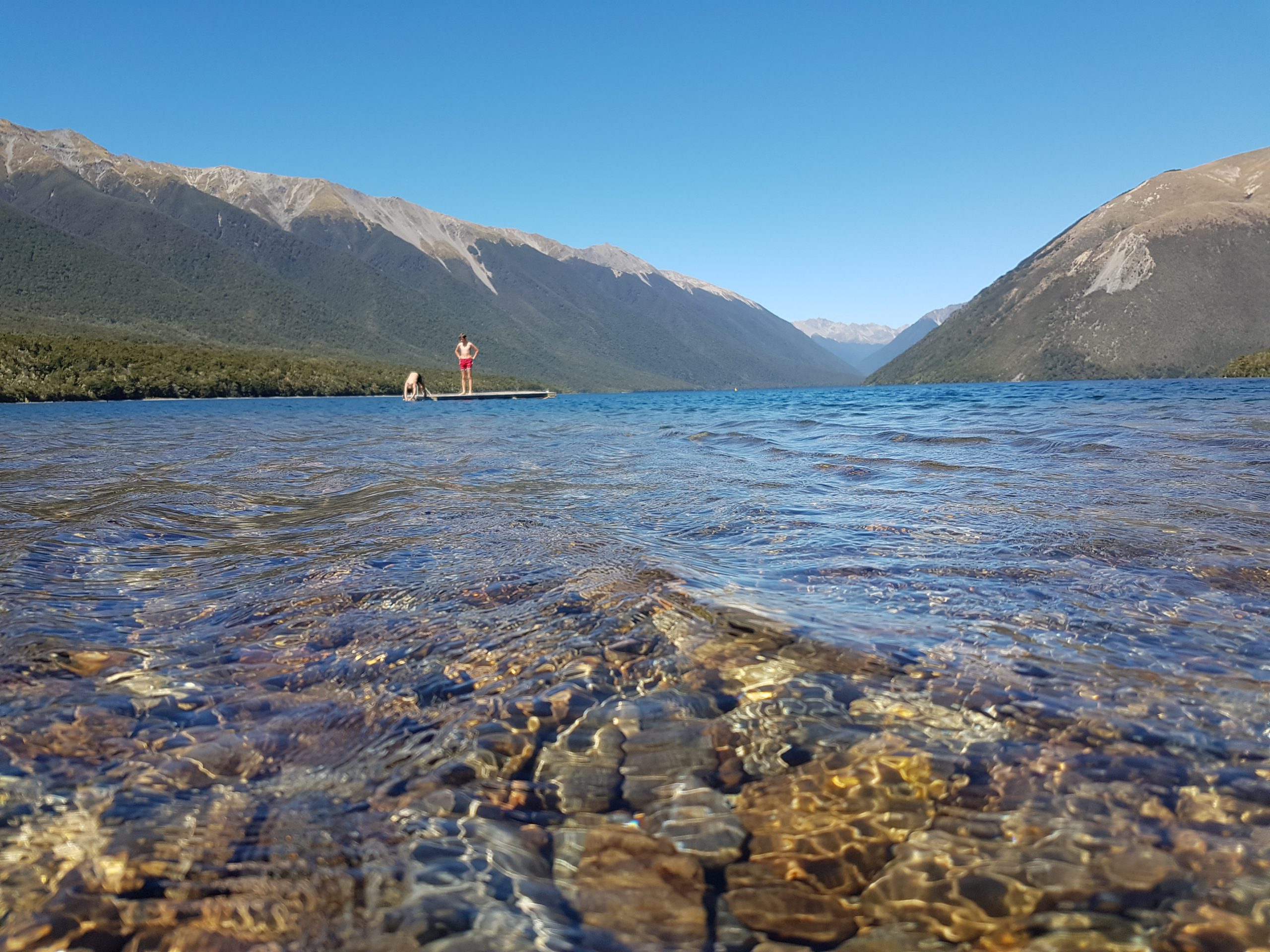 I Nelson National Park kører vi ned til søen og stopper for at bade i det krystalklare ferskvand. Efter vi havde hørt Zak på Frans Josef Gletsjeren fortælle om mængden af ferskvand, der er ophobet i gletsjere verden over, gik vi tilbage og læste mere om det, for det lød næsten for vildt til at være sandt. Det viser sig, at kun ca. 3% af alt vand på jorden er ferskvand og af det, at ca. 80% lagret i sne og is. Resten er i jorden, søer, floder og skyer. Efterhånden som de oplysninger er sivet ind, virker det som en helt mærkelig form for luksus at bade i den klare sø, hvor vi også kan drikke vandet. Drengene svømmer ud til en platform og så ser vi ikke dem i lang tid.