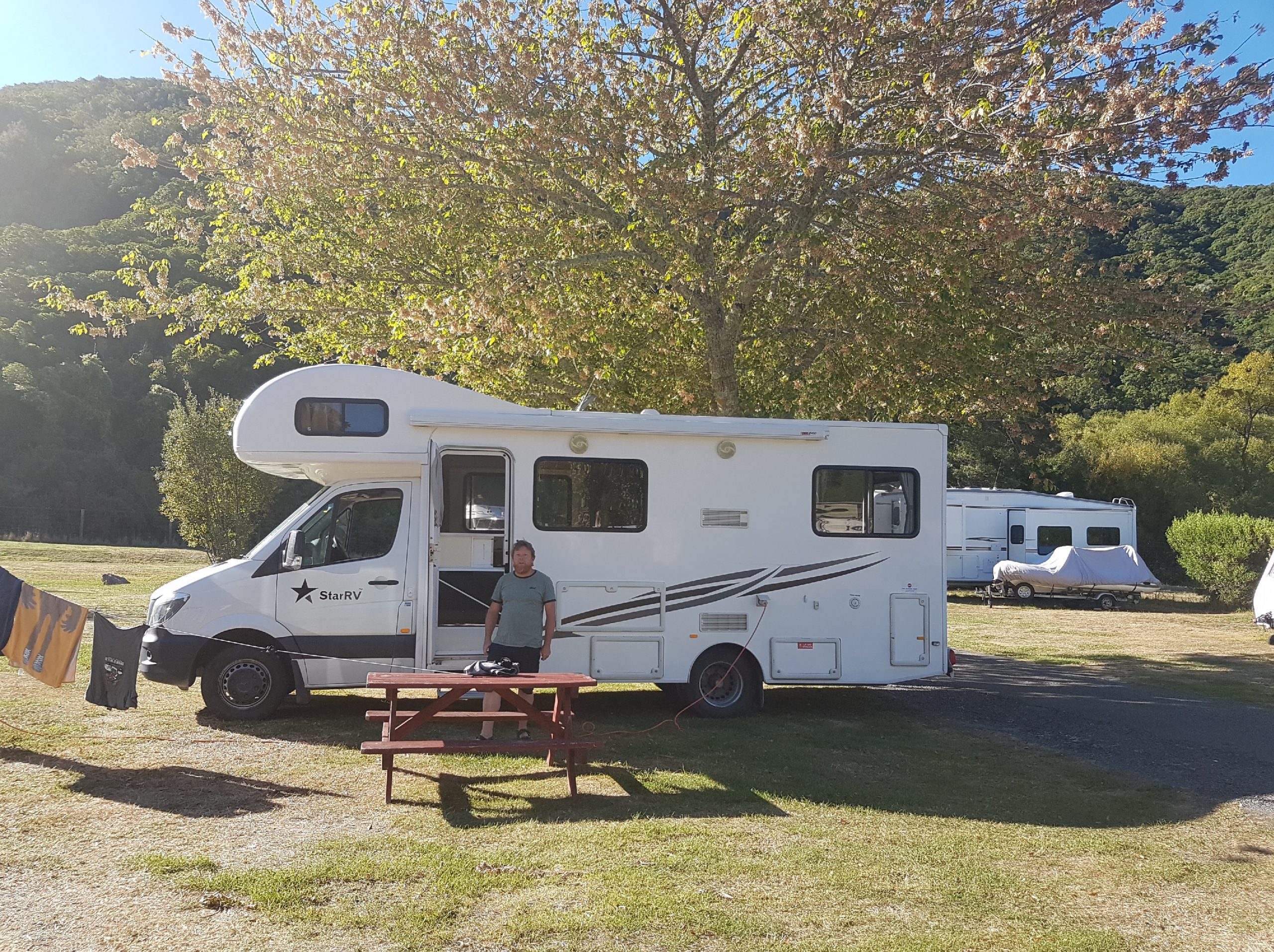 I Picton er der god plads i en grøn skovlund lige uden for byen. Bonus for drengene er poolen, som de tilsyneladende har helt for sig selv. Vi vil gerne ned at se lystbådehavnen og ender nede hos Jolly Roger, en hyggelig havnerestaurant, hvor Rasmus og jeg endelig smager en ”Battered Butterfish”. Ikke dårligt! Vi nåede desværre at spise det meste af den, inden jeg fik taget et billede, men vi tager i hvert fald afsked med Sydøen med manér.