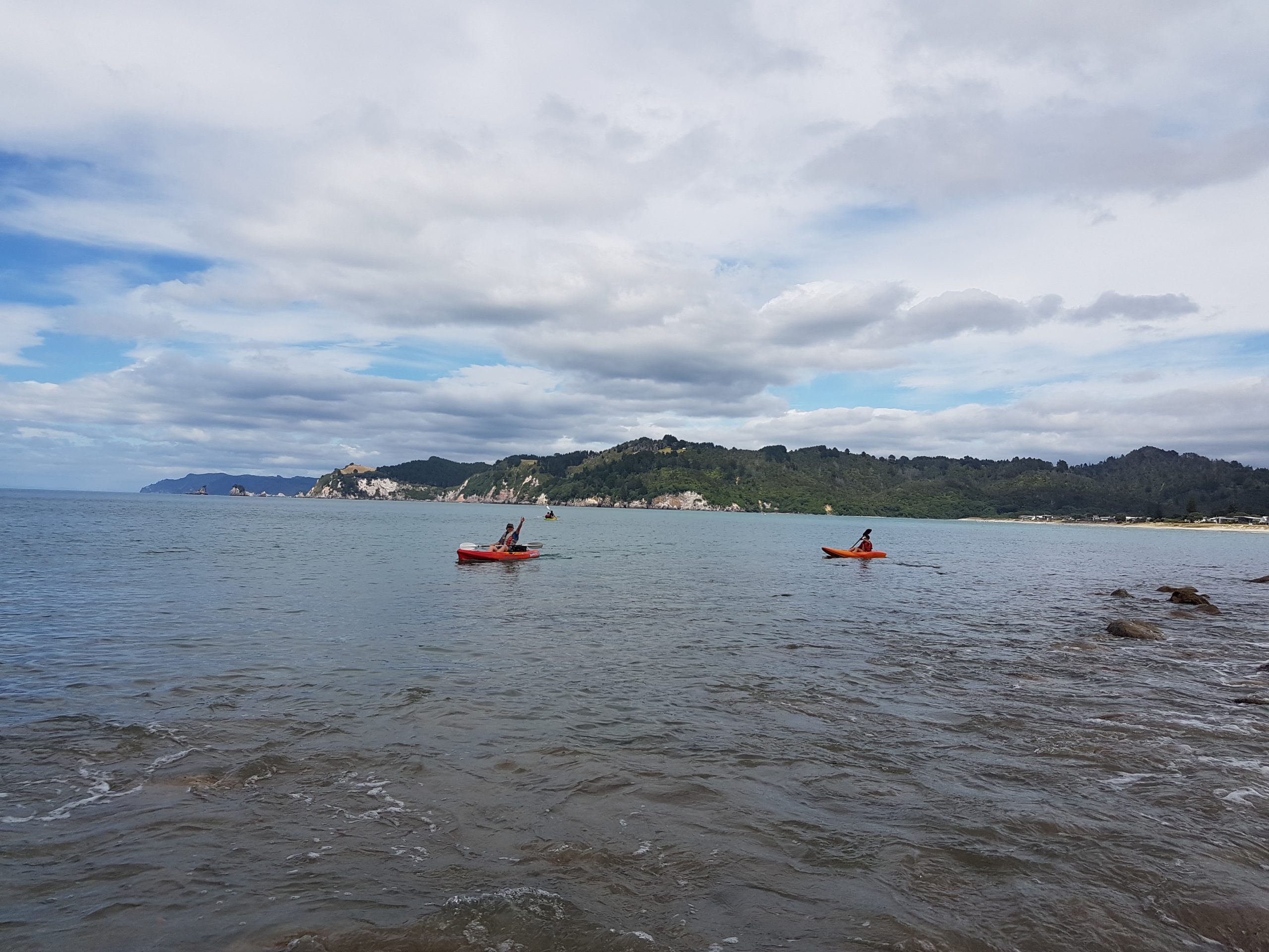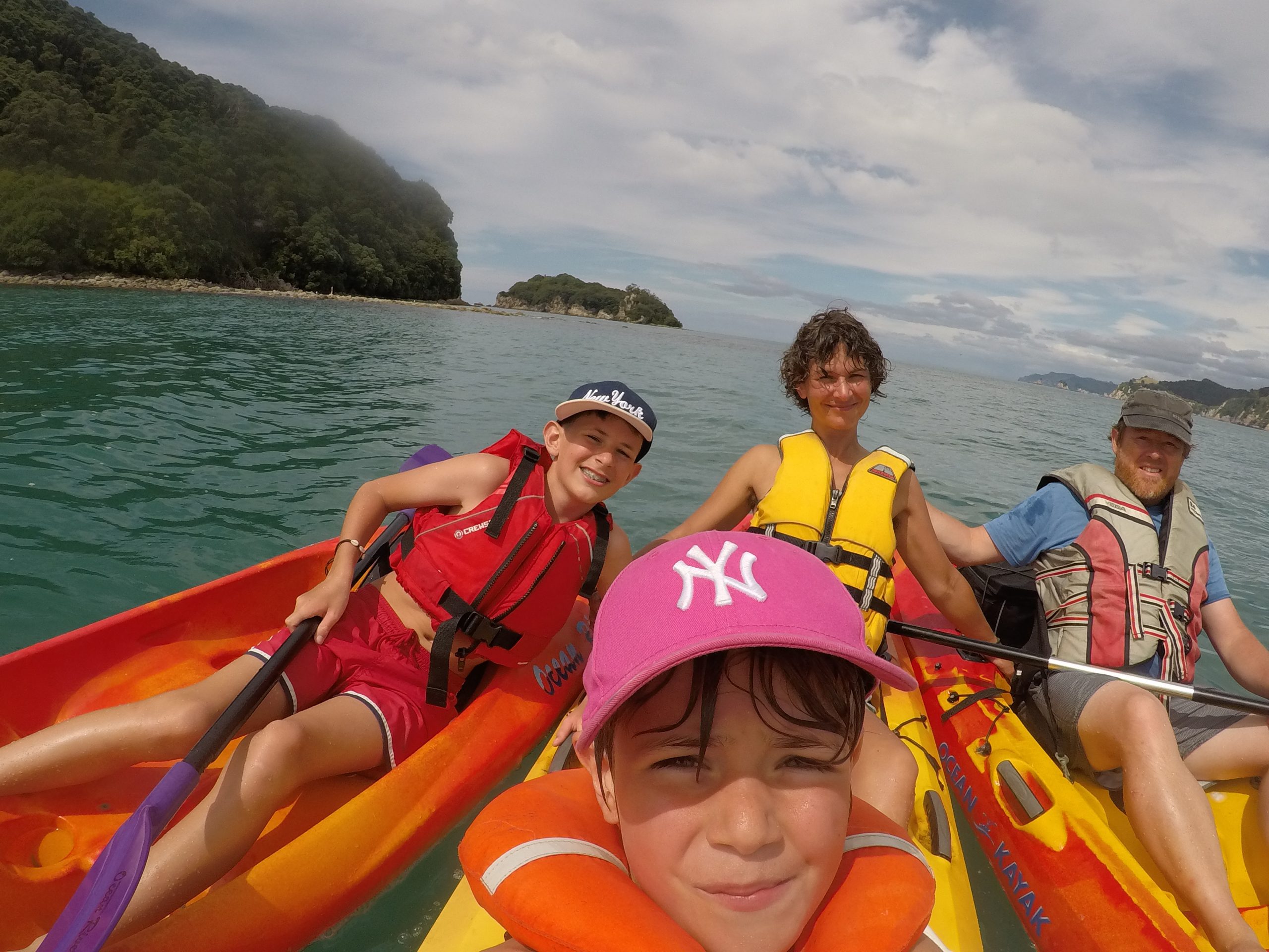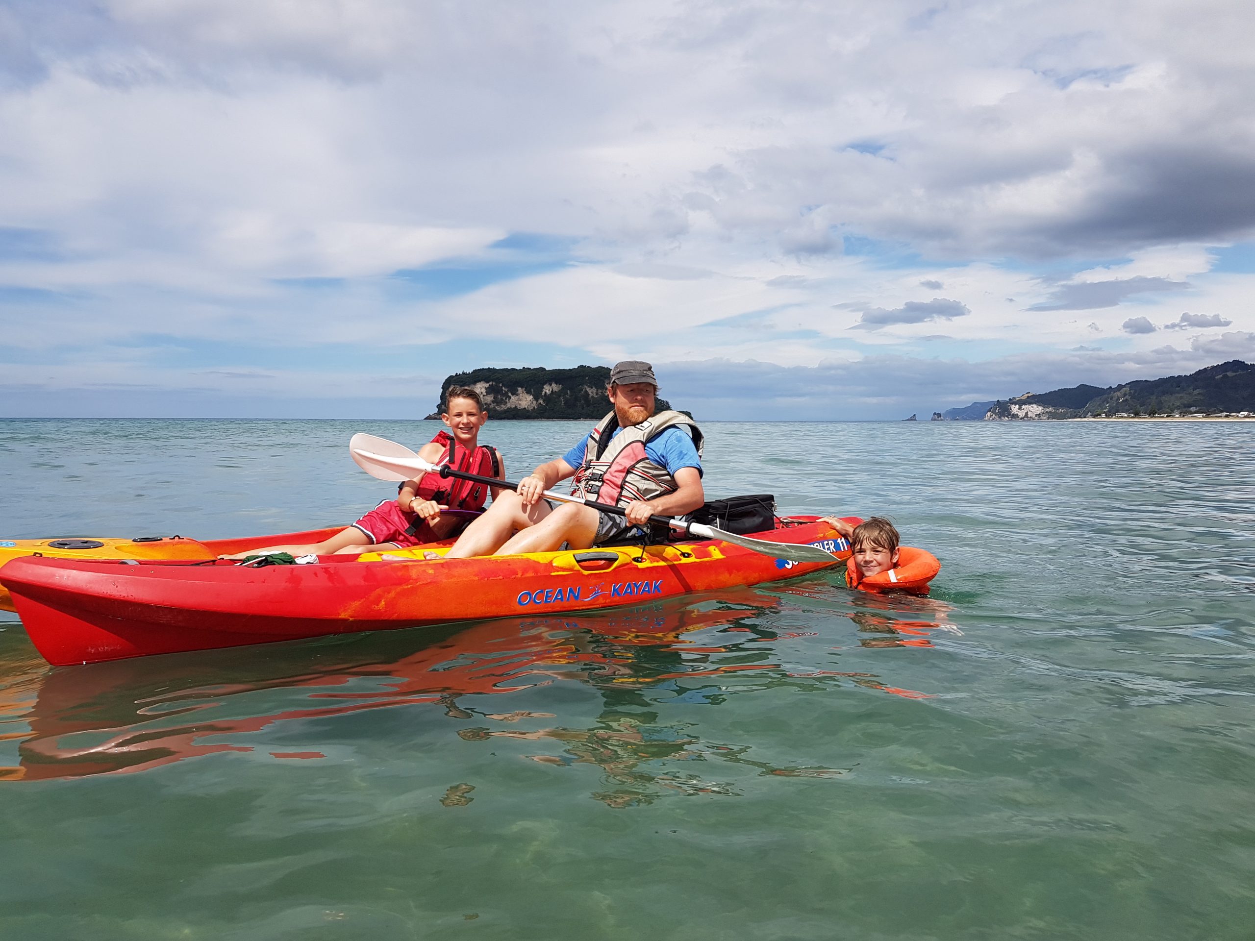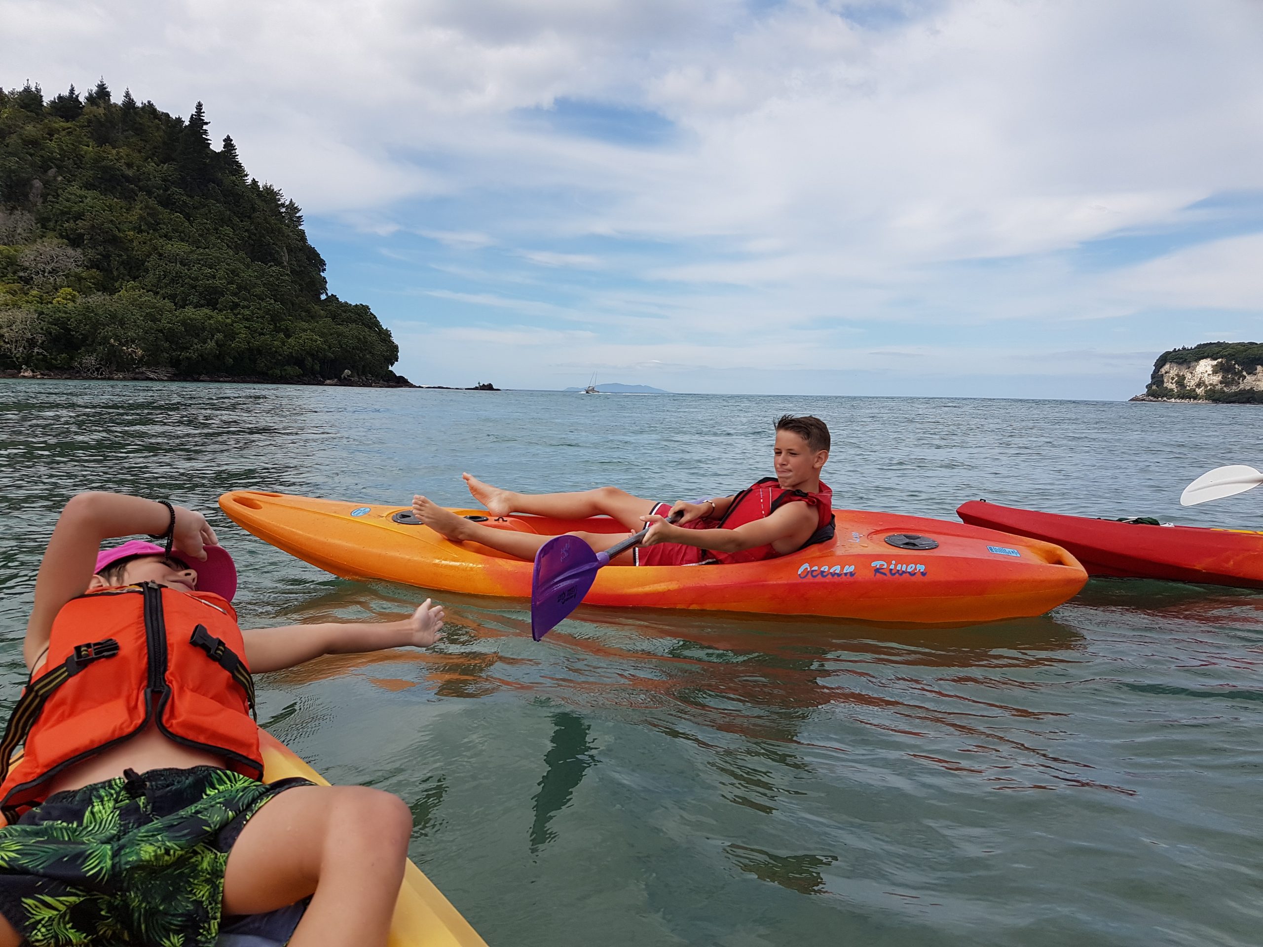 Vi bliver forkælet igen. Morgenmaden springer alle rammer, for Carla vil være sikker på, at vi ikke løber tør for energi i dag. Vi har lånt deres 2 kajakker og sammen med naboens 2, tager vi alle 4 på langtur ud i bugten ud for Whangamata. Igen er er vi heldige. Vind og vejr arter sig, så vi har optimale betingelser for vores eventyr. Det bliver til 4 timer på havet, frokost i en lille vig, badeture og gode grin. Det er jo ikke fordi, vi har stor erfaring i kajakdisciplinen, så nogle har brug for til hjælp og opmuntring, andre har brug for kortere eller længere pagajer. Igennem det hele, er Rasmus klar med kamera. Når jeg kigger billederne igennem, er de næsten et koncentrat af vores tur denne gang. Alt er klappet, alt er gået godt, ingen uheld, unikke øjeblikke og oplevelser er faldet ned i skødet på os. En dreng er vokset på alle måder siden sidste familierejse, mens en anden stadig hygger sig med at være lidt mindre.