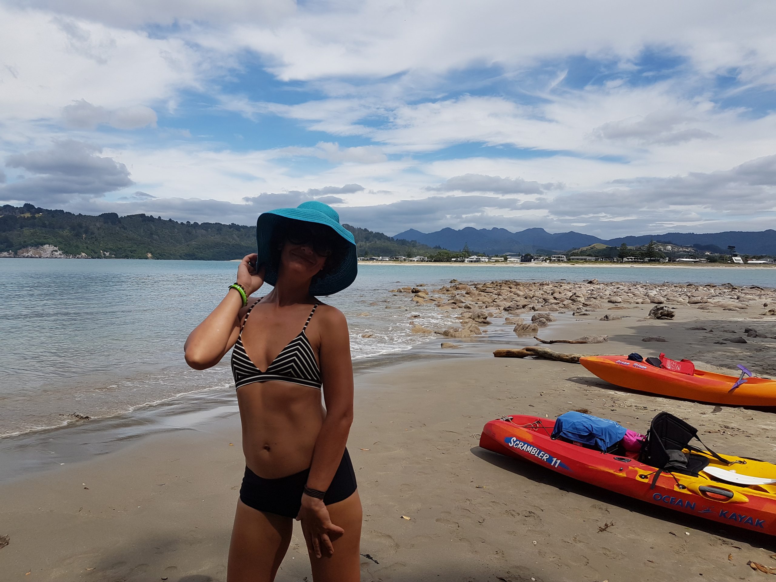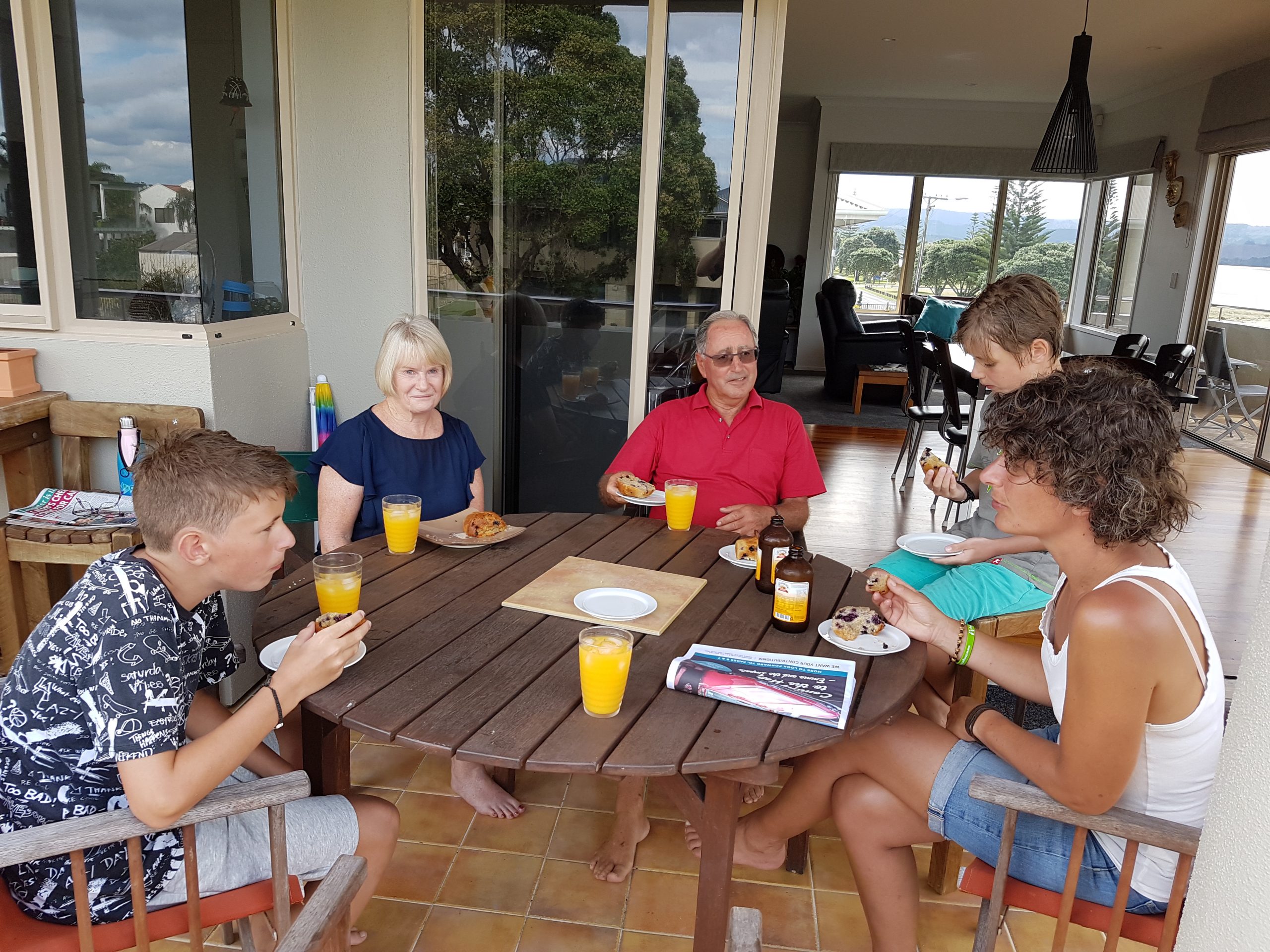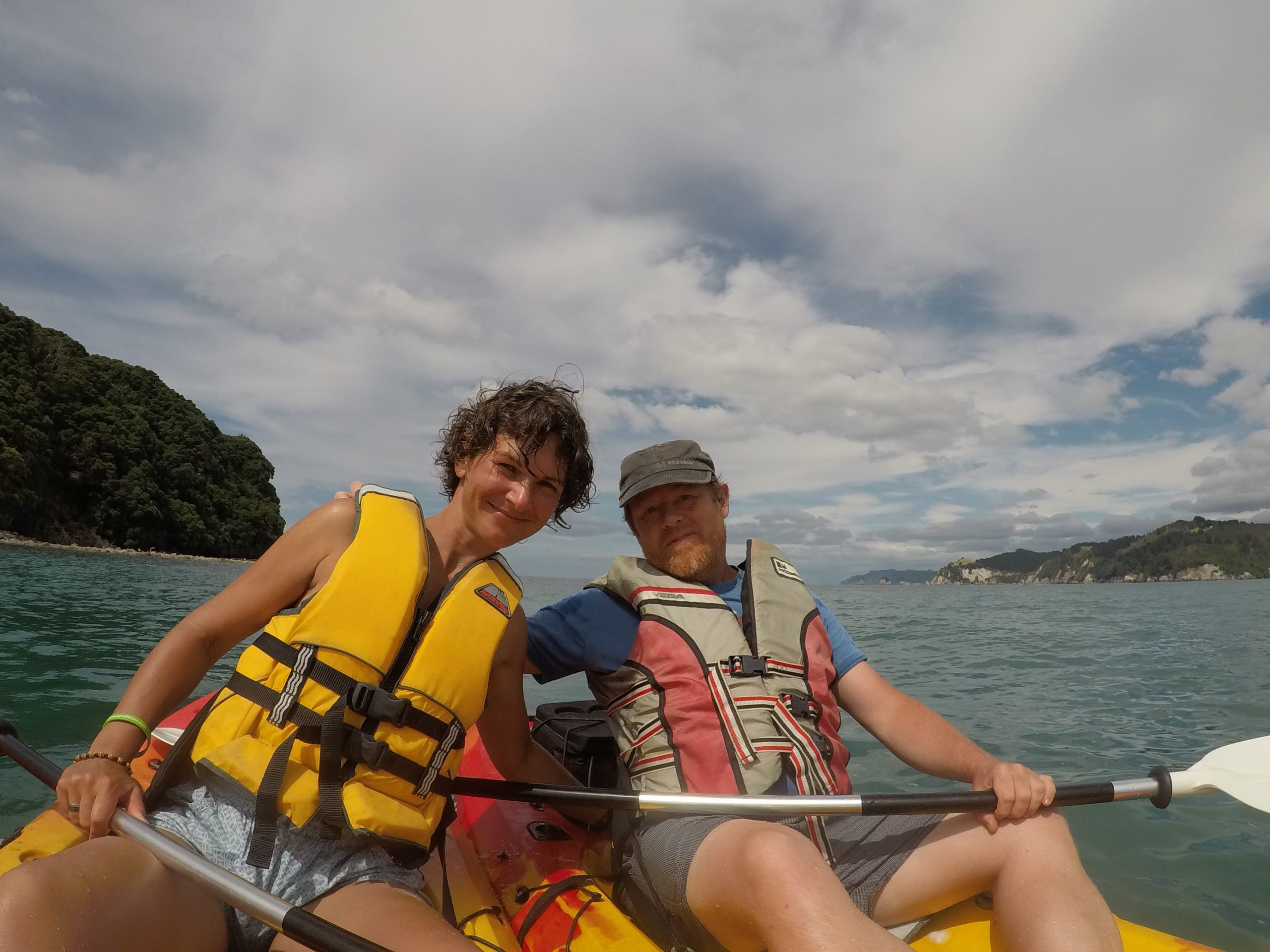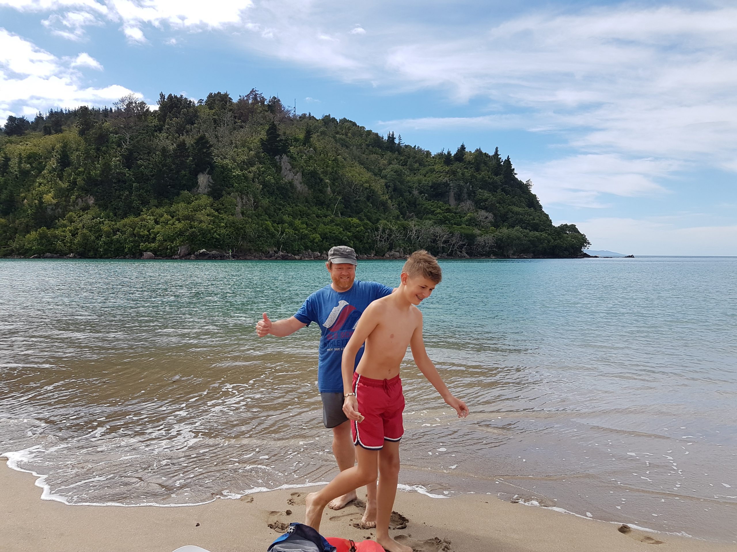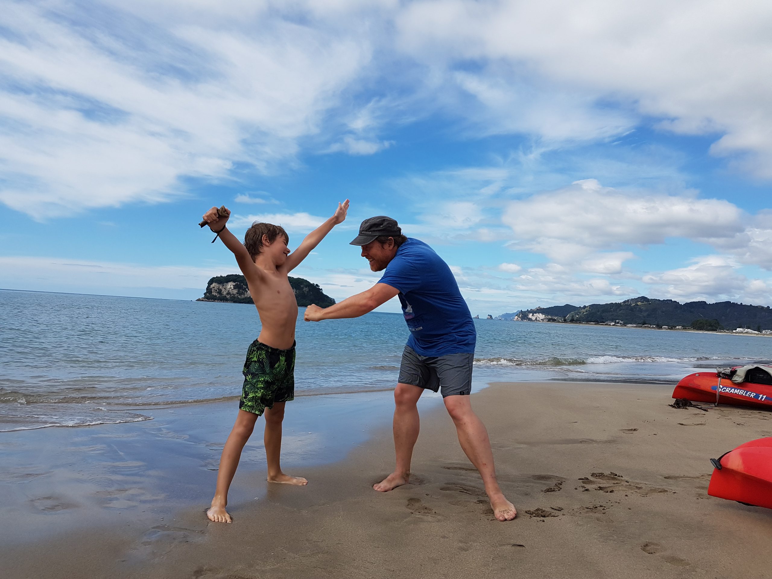 Vi bliver forkælet igen. Morgenmaden springer alle rammer, for Carla vil være sikker på, at vi ikke løber tør for energi i dag. Vi har lånt deres 2 kajakker og sammen med naboens 2, tager vi alle 4 på langtur ud i bugten ud for Whangamata. Igen er er vi heldige. Vind og vejr arter sig, så vi har optimale betingelser for vores eventyr. Det bliver til 4 timer på havet, frokost i en lille vig, badeture og gode grin. Det er jo ikke fordi, vi har stor erfaring i kajakdisciplinen, så nogle har brug for til hjælp og opmuntring, andre har brug for kortere eller længere pagajer. Igennem det hele, er Rasmus klar med kamera. Når jeg kigger billederne igennem, er de næsten et koncentrat af vores tur denne gang. Alt er klappet, alt er gået godt, ingen uheld, unikke øjeblikke og oplevelser er faldet ned i skødet på os. En dreng er vokset på alle måder siden sidste familierejse, mens en anden stadig hygger sig med at være lidt mindre.