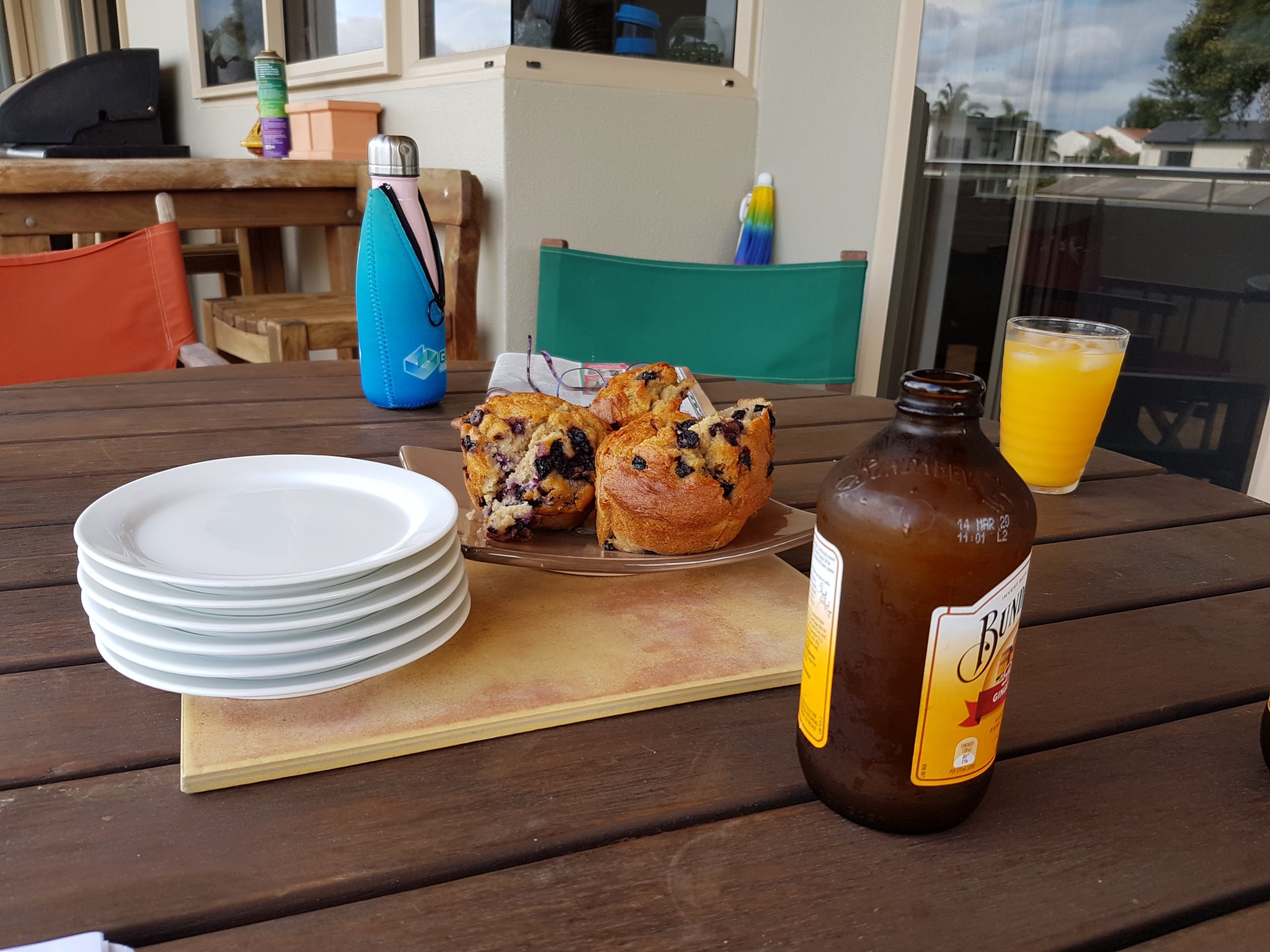 På terrassen slutter vi af med blåbærmuffins, gingerbear og juice. – og så skal vi huske familiebillederne igen.
