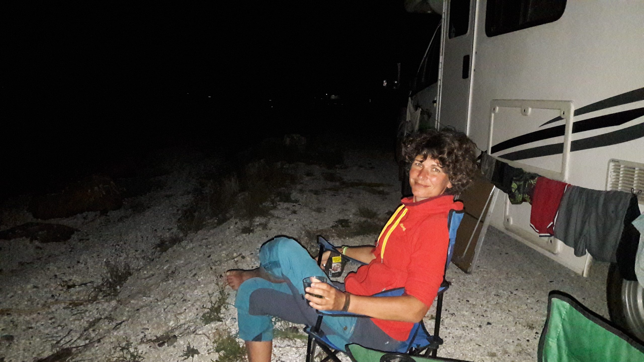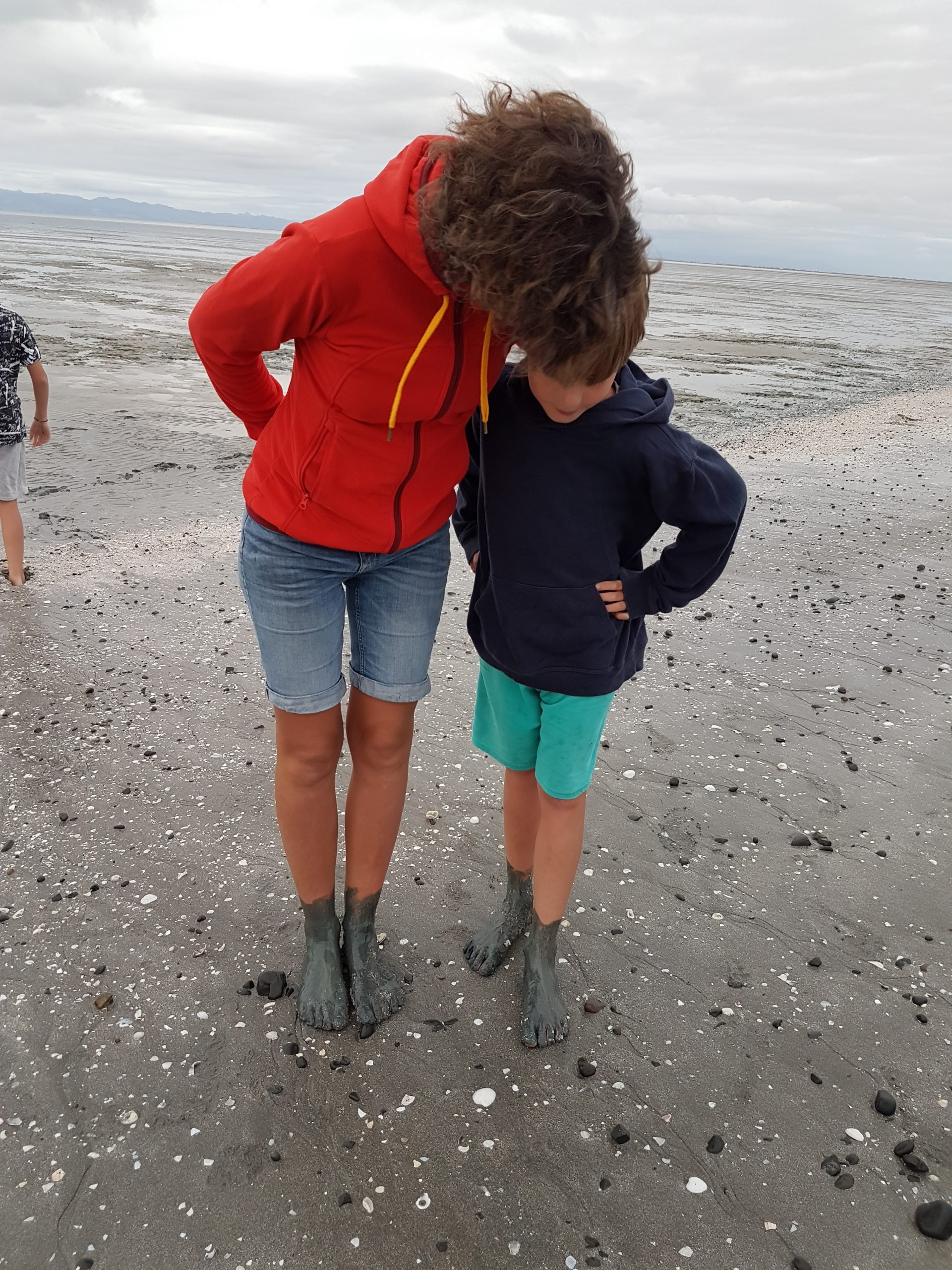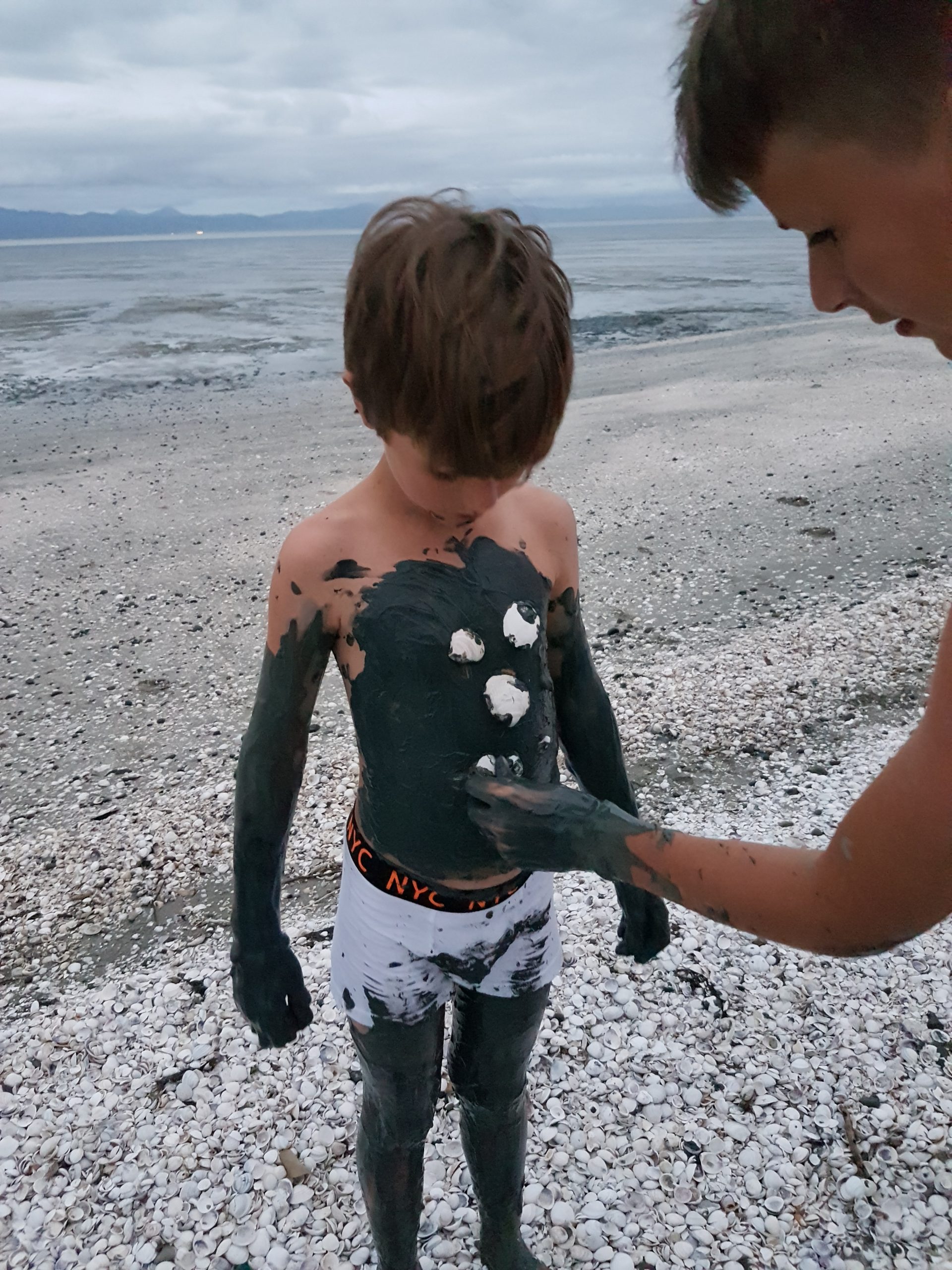 Vi laver aftensmad mens drengene starter med at soppe. Da det ikke er muligt, fordi der intet vand er, bliver det stille og roligt bare til mudderbadning. Det fornøjer de to drenge i lang tid. Det fornøjer også de folk, der går tur langs stranden. Vi står tilbage med rengøringen, men det klarer vi næsten i en ruf med vores udendørs bruser : )