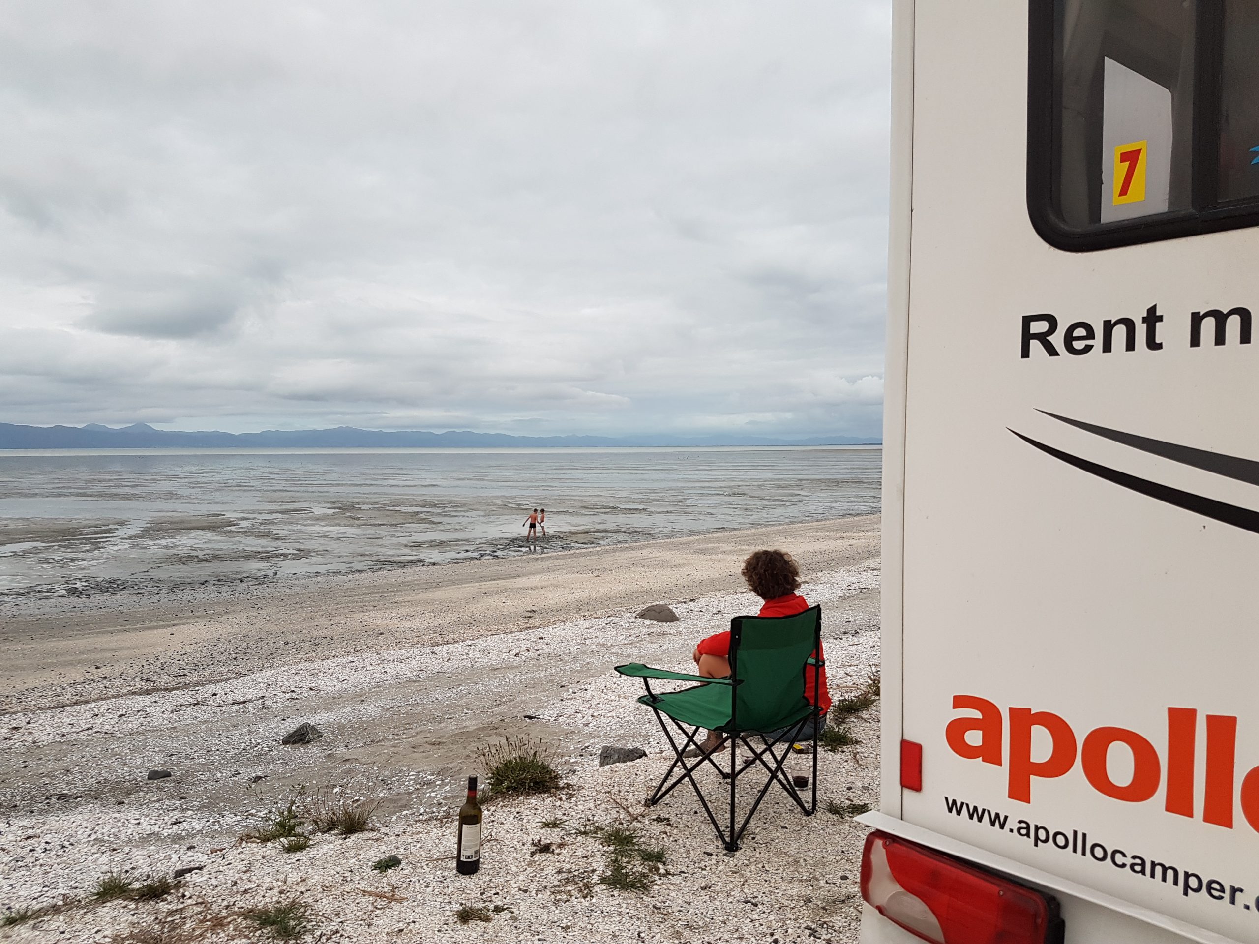 Campsitet skulle ligge ved en strand og det gør det på sin vis også. Det er bare i bunden af den fjord, der ligger mellem Coromandel og den vestlige del af Nordøen. Lige nu er det lavvande og stranden er en mudderpøl.