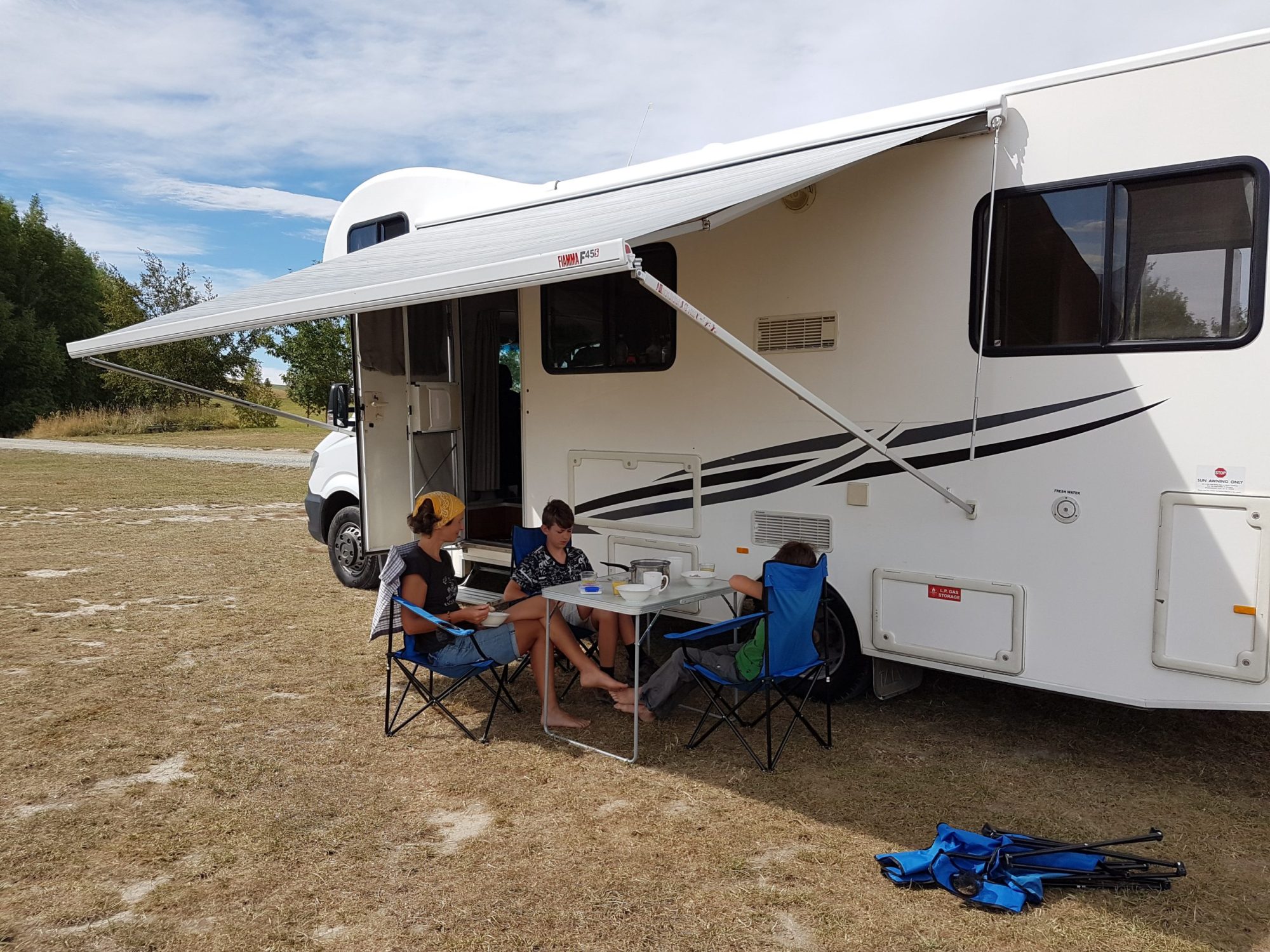 Jeg starter med at trille ud i vores motorhome, herefter kaldet IB. Inden vi kom afsted skulle de lige montere den manglende markise. OC her i NZ er oppe på 11, når solen skinner så vi ventede gerne ½ time på den.