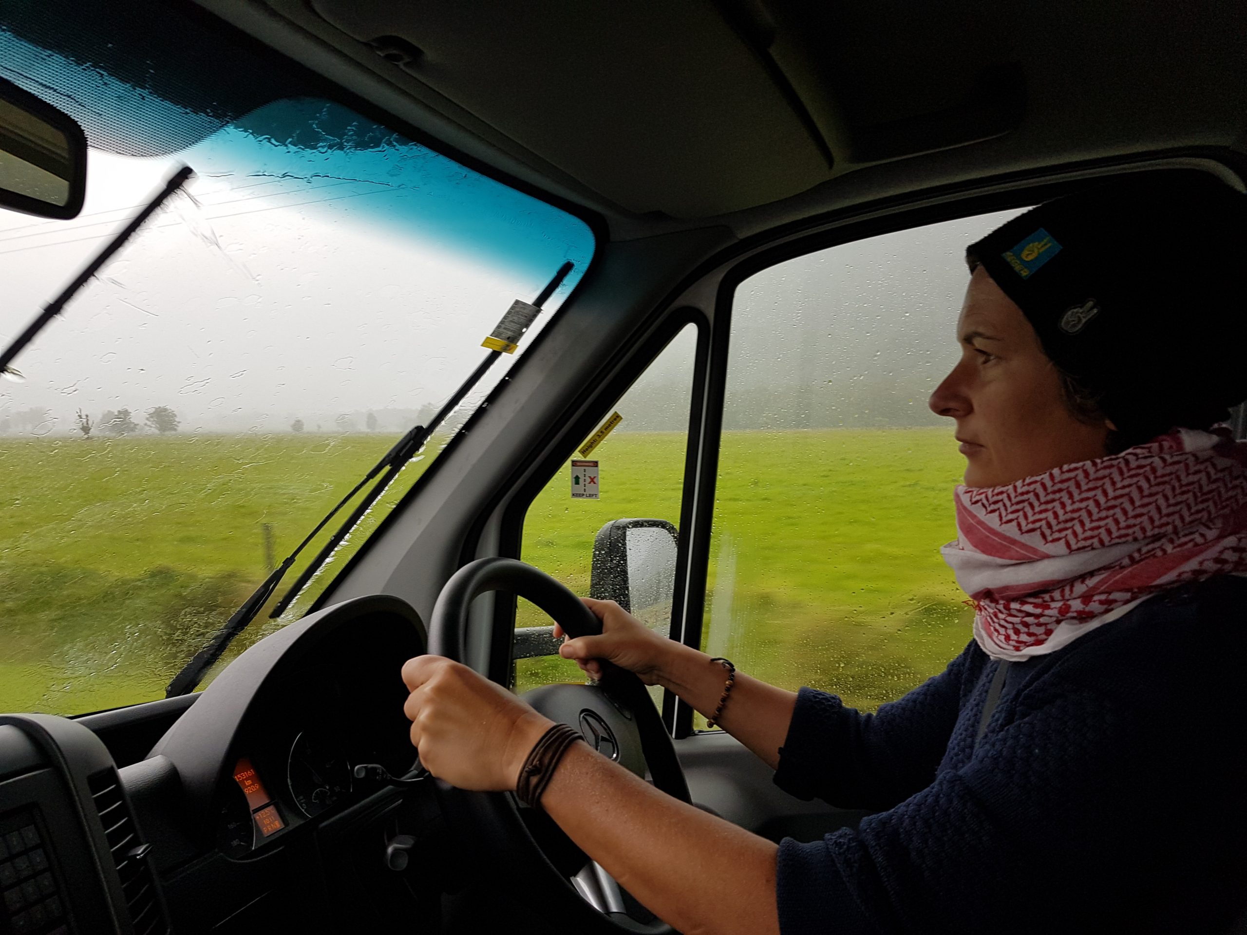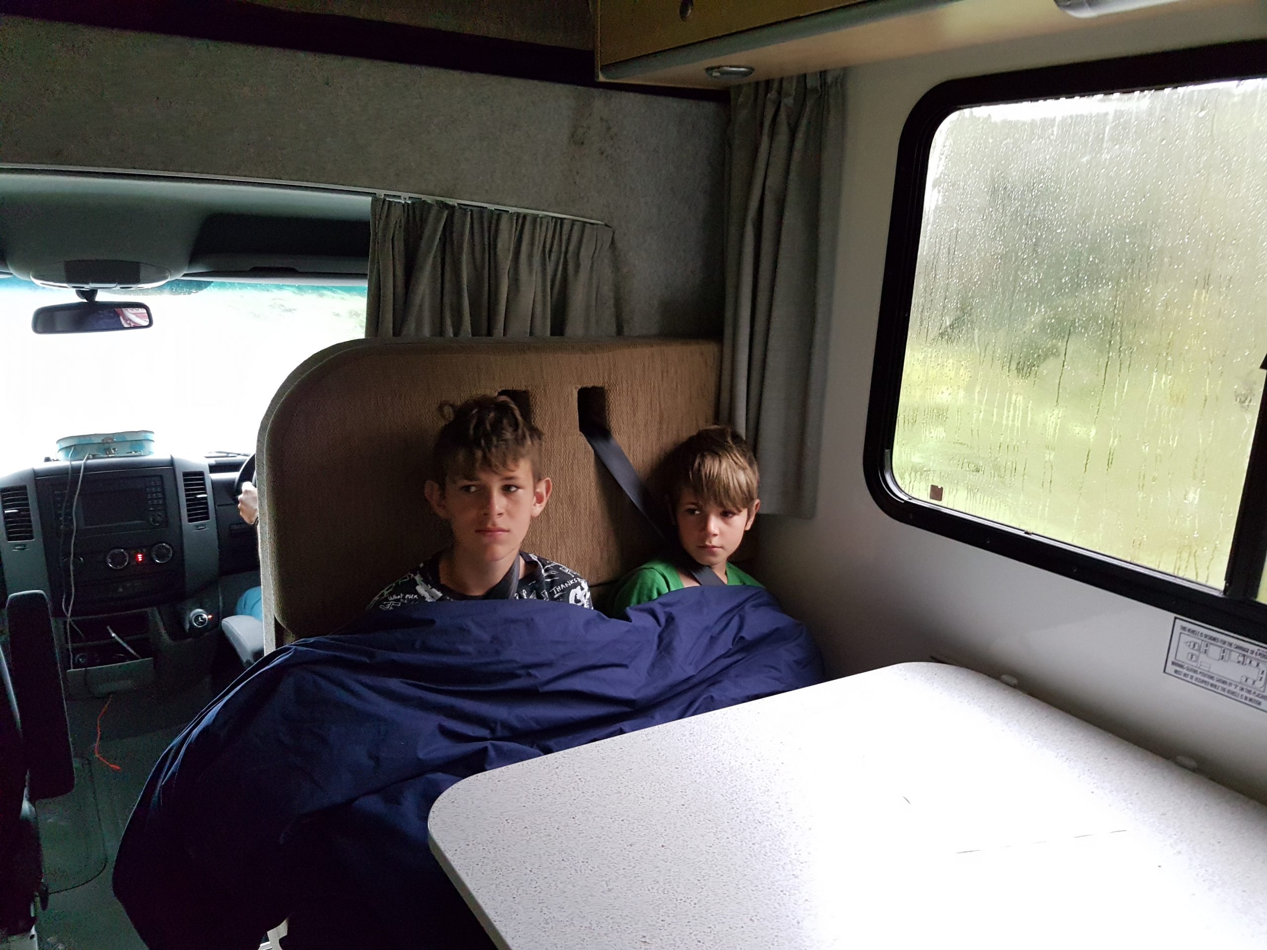 Midt om natten vågner vi, fordi det regner. Det regner ned gennem vores ovenlysvinduer og ind gennem ruderne bagi, hvor vi ligger. Vi prøver at lukke hullerne, men her til morgen er vores madrasser våde og der er en sø ned igennem camperen.