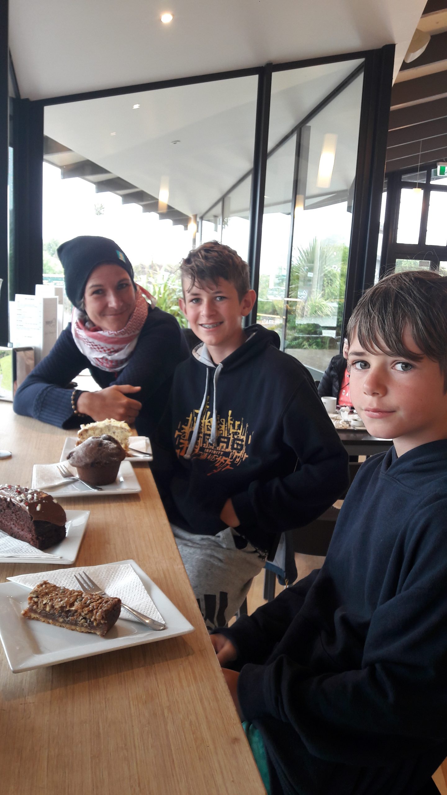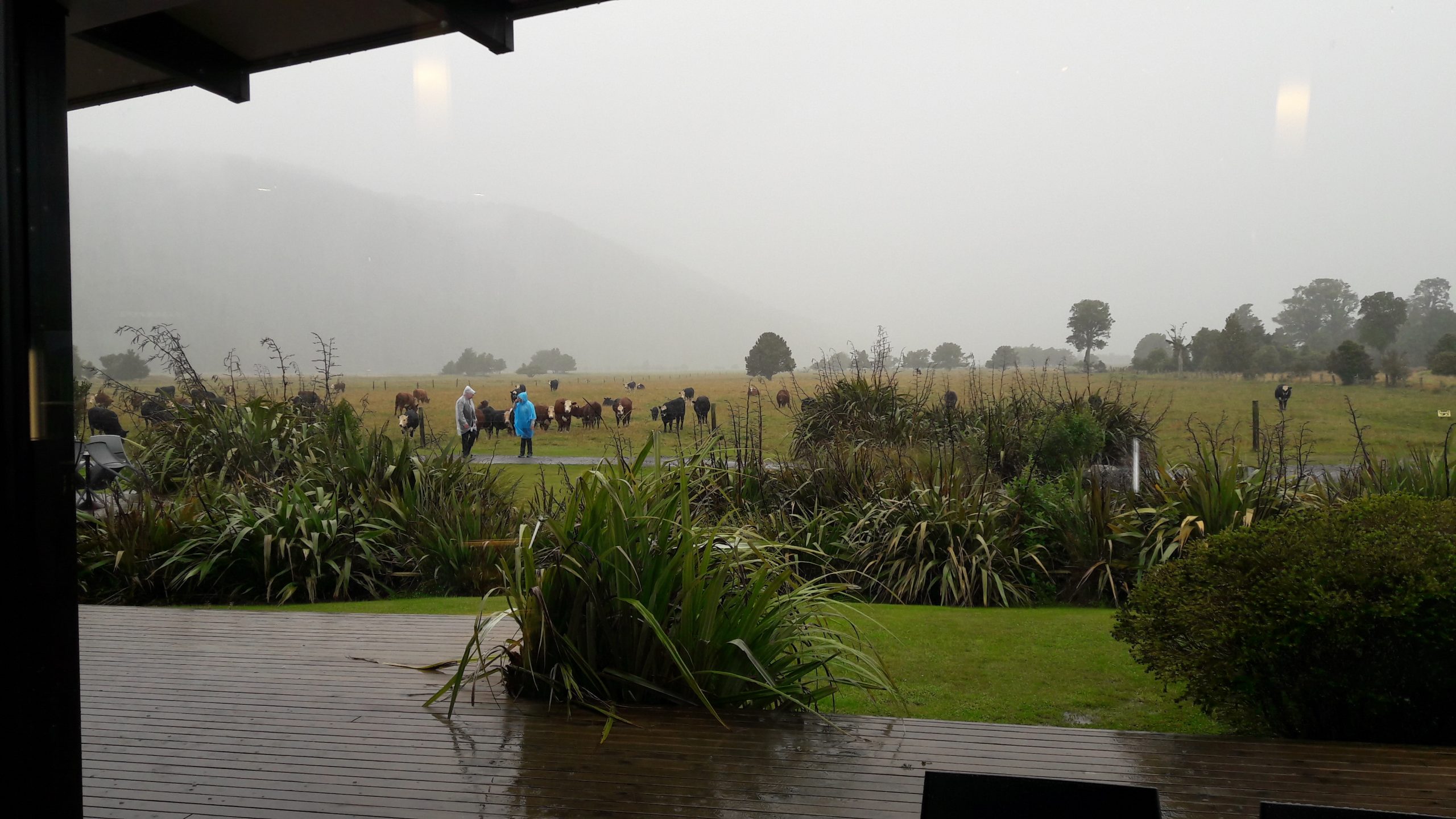 Opklaring må vi kigge langt efter, mens vi sidder i den hyggelige bjælkecafé ved Lake Matheson. Til gengæld har de verdens bedste kager. Vi får en chokolademuffin, en choko- og hindbærkage, en honningkage og en humlebi- og birkeskage. Sammen med varm kaffe og kakao er vi fuldt ud tilfredse med at kigge på de regnvåde køer uden for vinduet og bruge tiden i den fine shop ved siden af. Der er et hav af pauaskaller, possumsokker, uldhuer og -handsker, jadesmukker, børnekiwibøger og div. t-shirts med kiwitekster og -motiver.
